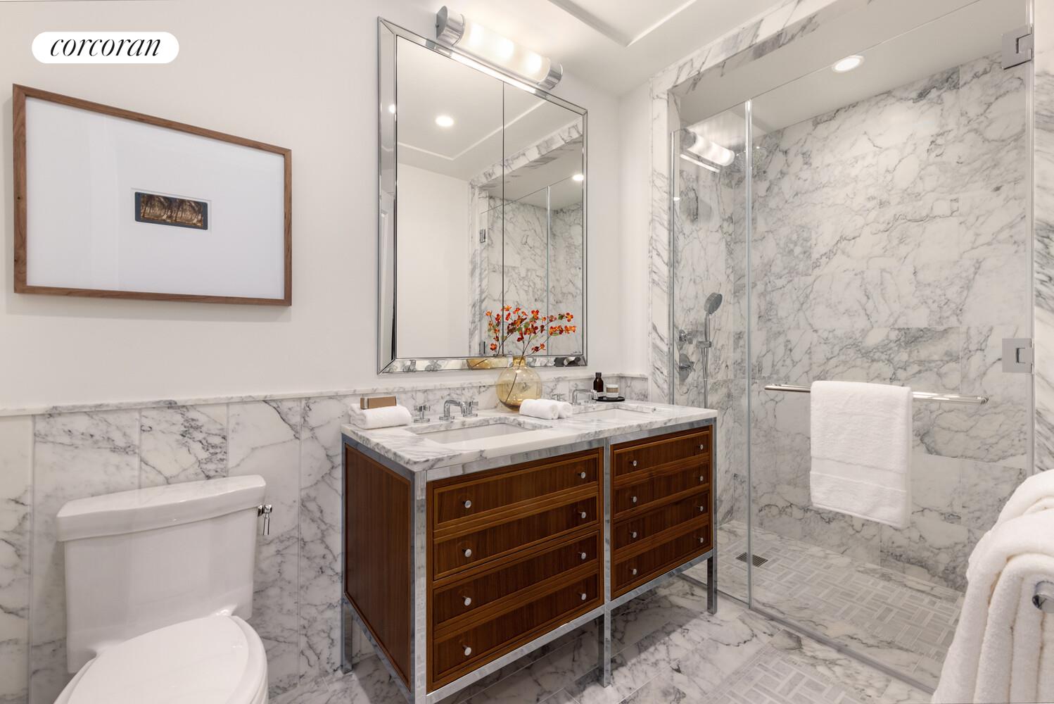 Primary baths are finished with Arabescato Cervaiole marble and feature marble mosaic tile flooring and custom sconces in polished chrome. Each primary bath includes a RAMSA-designed Italian walnut vanity with Arabescato Cervaiole marble countertop, polished chrome fixtures by Kallista, custom designed mirrored medicine cabinet by Robern, and water closet fixtures by Toto.
