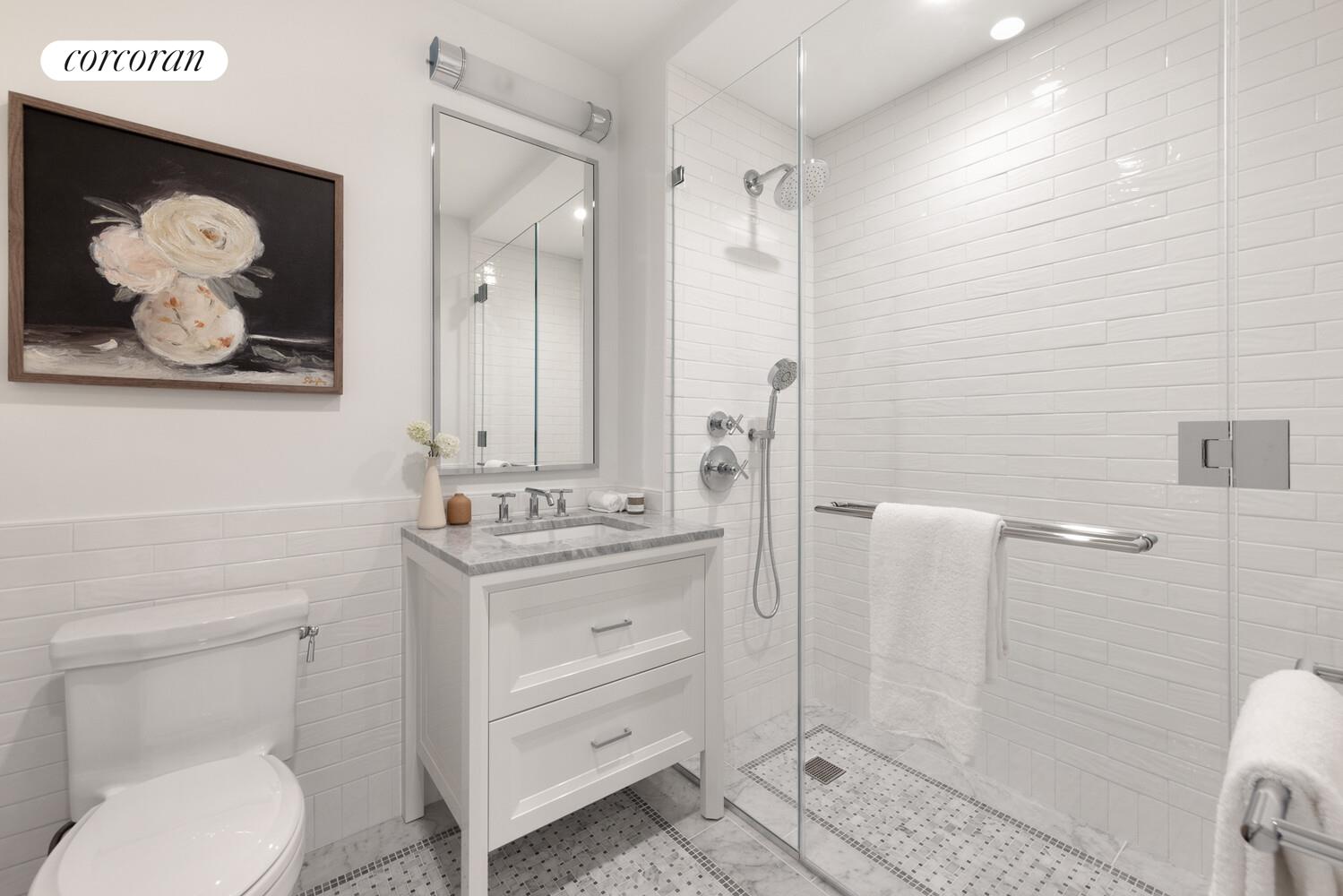 Secondary baths are well appointed with marble mosaic tile flooring framed by Bianco Carrara border and ceramic tile surround, ceramic tile shower surround, custom vanities designed by RAMSA, Grigio Toscana marble countertops, and Kohler undermount sinks with polished chrome hardware from Purist by Kohler. Secondary baths also include oversized mirrored medicine cabinets with polished chrome frames by Robern, Kohler soaking tubs or showers with polished chrome Purist rain showerheads and hand-held sprayers by Kohler, and water closets by Toto.