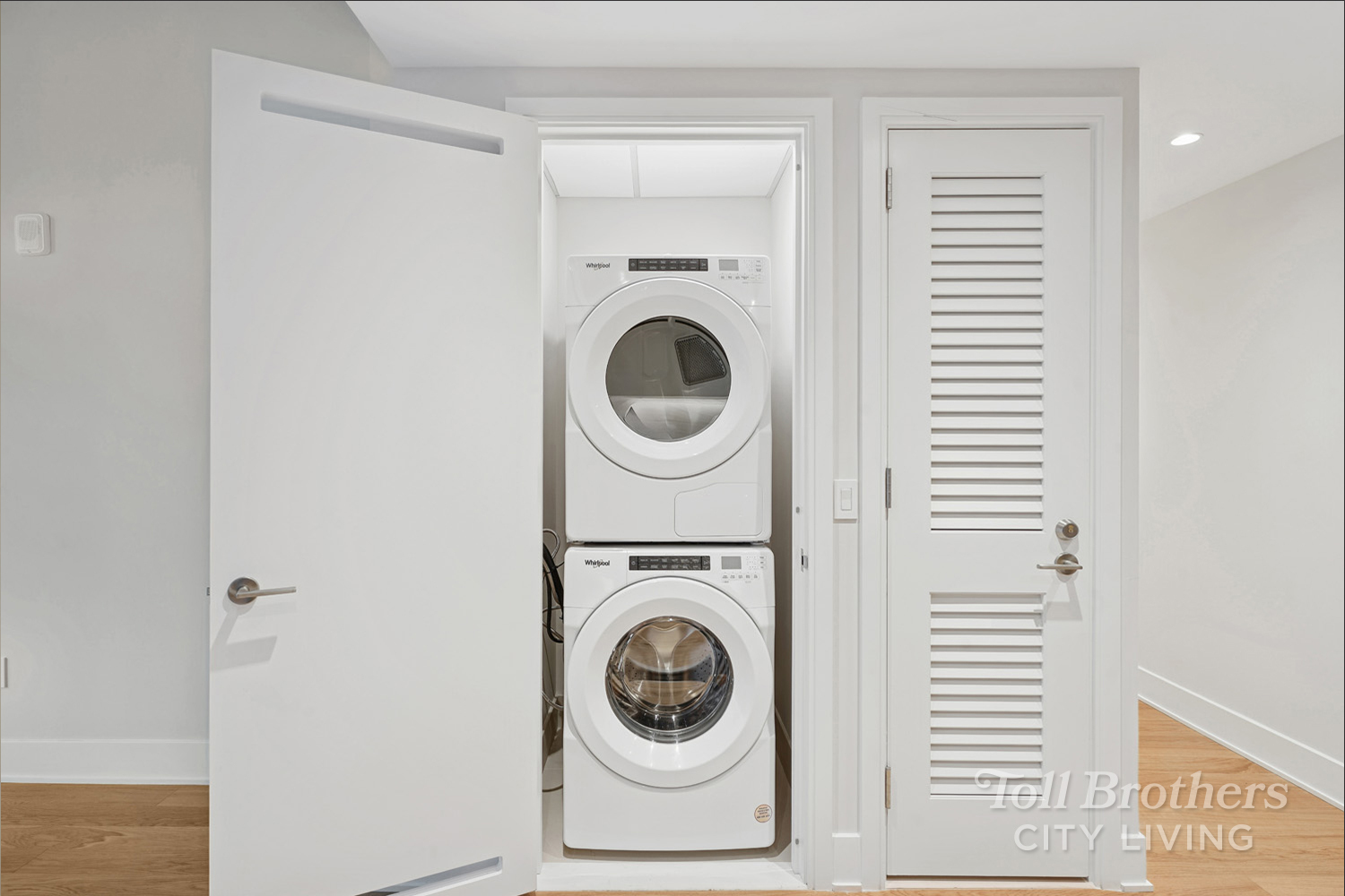 Residence 10B is an 815SF one of a kind 1-bedroom home with an appealing open layout, 5" white oak floors, and 10’ ceilings. The living room is facing West on Broadway. Eastern-facing bedroom windows overlook tree-filled back yards. The bathroom features a custom Poliform vanity topped with quartz, Porcelanosa tiled walls, and a porcelain mosaic tile floor. The kitchen features custom Poliform cabinetry with abundant storage, integrated Bosch appliances, and striking Brazilian quartzite countertops and backsplash. Each home is equipped with a full-size Whirlpool washer and dryer.