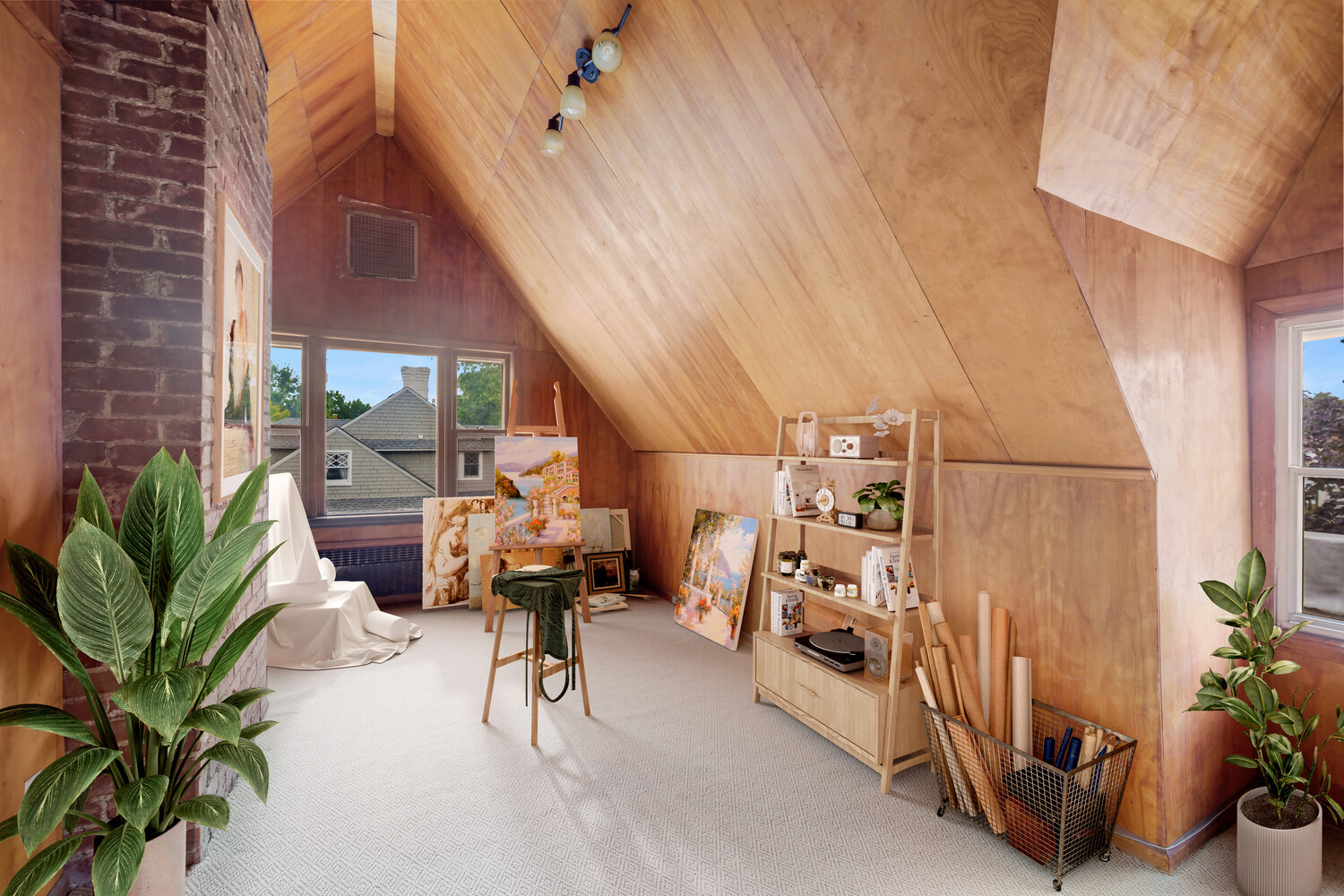 Upstairs, the second floor offers four spacious, corner bedrooms and two full baths, including a primary suite with its own fireplace, ensuite bath, and two closets including a walk-in. One of the bedrooms has an adjoining office area and private garden access via the back staircase, creating the perfect guest suite, au pair quarters, or private work-from-home retreat. The third floor expands the possibilities even further with its peaked ceilings and generous proportions, offering two more sunny bedrooms, and another flex-room (think media room, yoga studio, playroom, or spa-like retreat!).