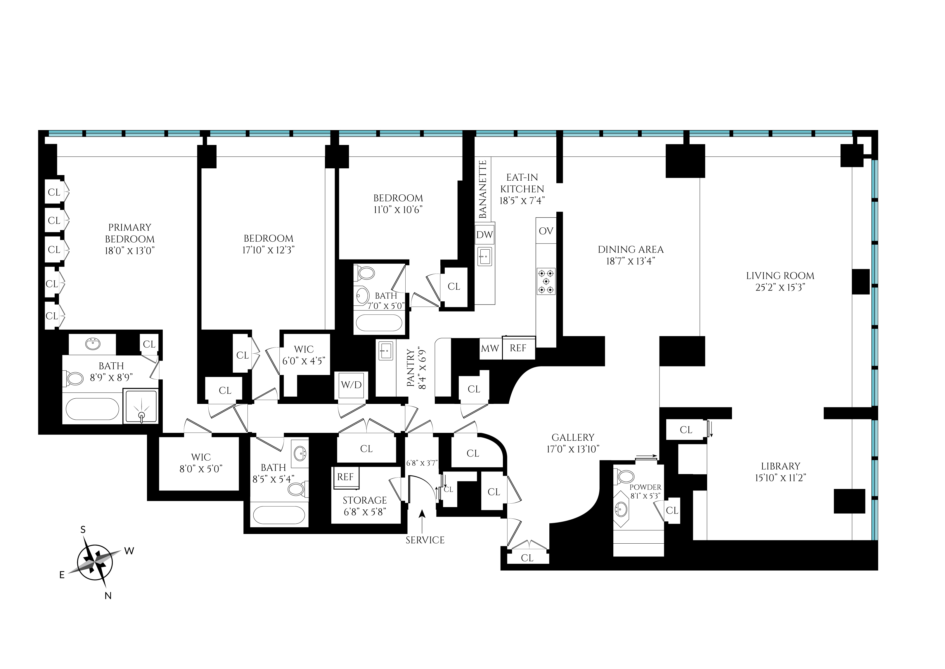 The East Wing is designed for privacy and comfort, with three large Bedrooms. The Primary Suite spans 18' by 13', framed by River Views and mirrored closets, and includes an En-Suite Marble Bathroom. The Secondary Bedrooms are equally generous, with excellent storage and natural light.