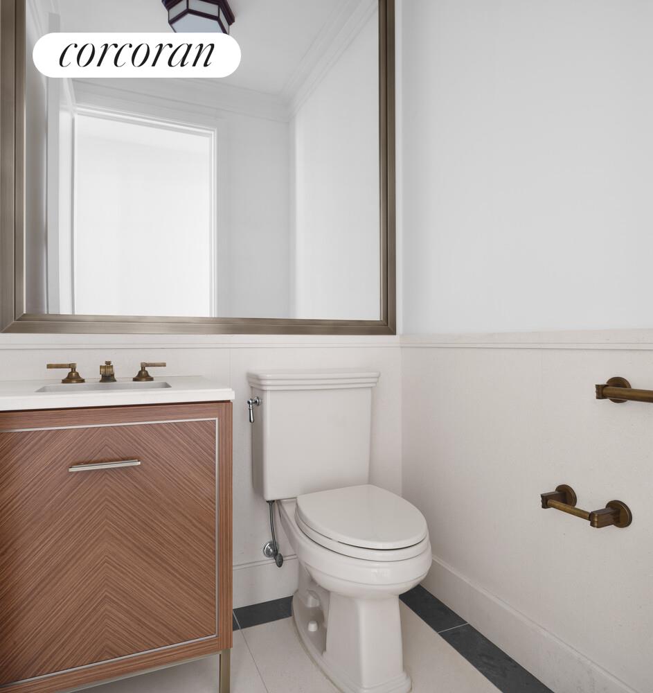 The primary suite is a tranquil and private retreat, featuring an expansive spa-like bath clad in oversized porcelain slabs, double vanity, radiant heated floors, and a luxurious wet room with steam shower, bench seating, niche shelving, and a freestanding soaking tub. The bedroom nearest the primary has been transformed into a bespoke dressing room with custom millwork, glass display cases, and a center island-an absolute dream for the fashion connoisseur. Another includes a built-in Murphy bed and custom storage, ideal for use as a guest suite or home office. Each of the secondary bedrooms includes an en-suite bath with vanilla cream marble vanity tops, herringbone-patterned tile flooring, and crackle-glazed white ceramic wall tile.