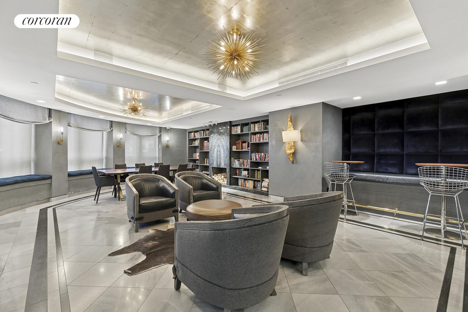 From your private elevator vestibule , enter a stately 30-foot gallery that introduces a home of grand scale and exceptional design. The 55-foot great room is bathed in natural light through five oversized north-facing windows and anchored by elegant proportions ideal for both formal entertaining and relaxed daily living. A corner library with gas fireplace and custom leather-wrapped millwork offers a quiet retreat of warmth and sophistication.