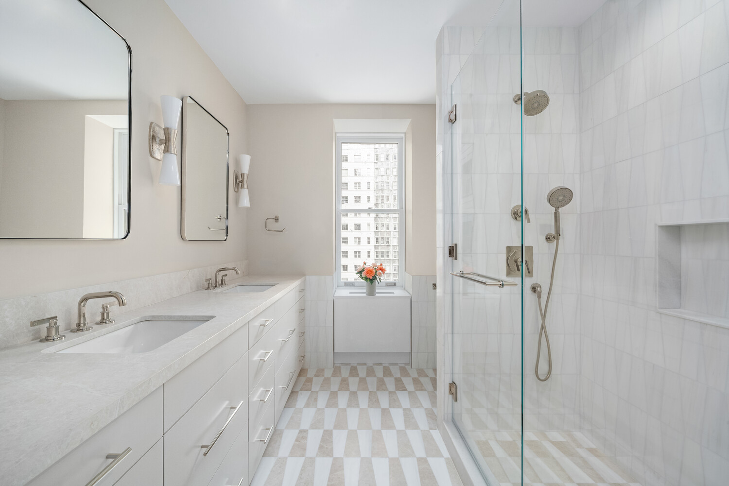 The primary bedroom suite overlooks the serene courtyard and offers a spacious walk-in closet and a spa-inspired en-suite bath appointed with honed marble mosaic floors and beautifully tiled walls extending to wainscoting. The second bedroom, also enjoying courtyard views, features its own en-suite bathroom and generous closet space.