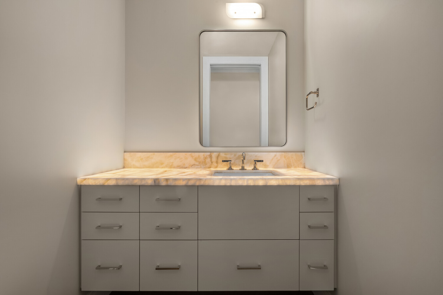 A separate powder room for guests showcases a striking backlit onyx stone vanity. The residence also includes a private laundry room with an LG washer and dryer. Comfort is ensured year-round with central air conditioning, individual climate zones in each room, and a high-performance, dedicated VRF HVAC system. Solid white oak floors with a custom stain run throughout the home.