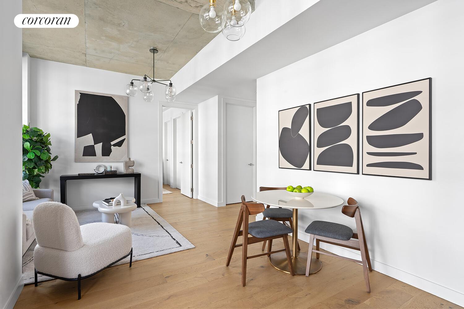 Contemporary finishes define the home, from wide-plank oak floors and exposed concrete ceilings to expansive Schuco casement oversized windows that fill the space with natural light. Modern essentials include multi-zone heating and cooling, and an in-unit washer/dryer.