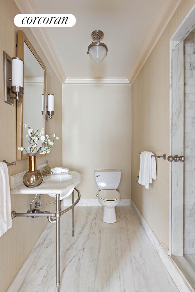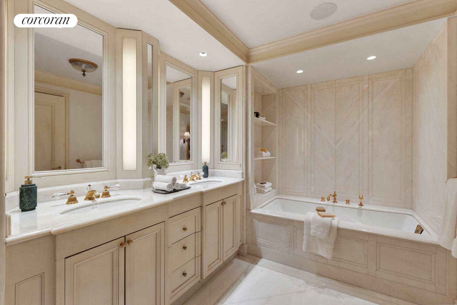 The primary suite is a light-filled, airy retreat facing south, offering warmth and sunlight throughout the day. Thoughtfully appointed with custom millwork, a built-in storage closet, and generous proportions, it provides a serene and elegant escape. The luxurious en-suite bath is clad in floor-to-ceiling marble and features a double vanity, deep soaking tub, oversized rain shower, and timeless brass fixtures.