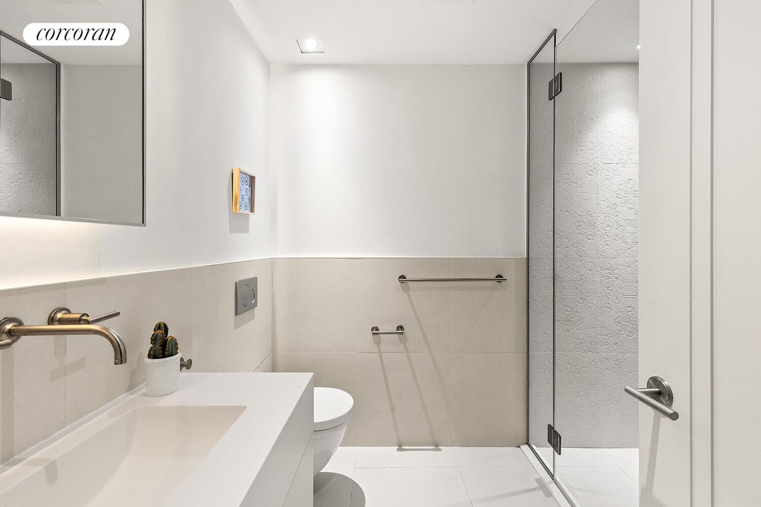 The elegant open concept chef's kitchen with top-of-the-line appliances has storage abound and a custom island. It features white oak wood finished cabinetry, beautiful marble countertops, and a full suite of stainless steel Bosch appliances.