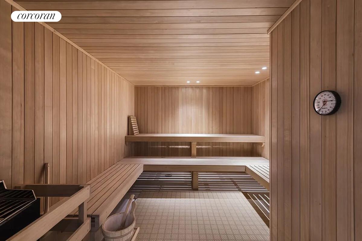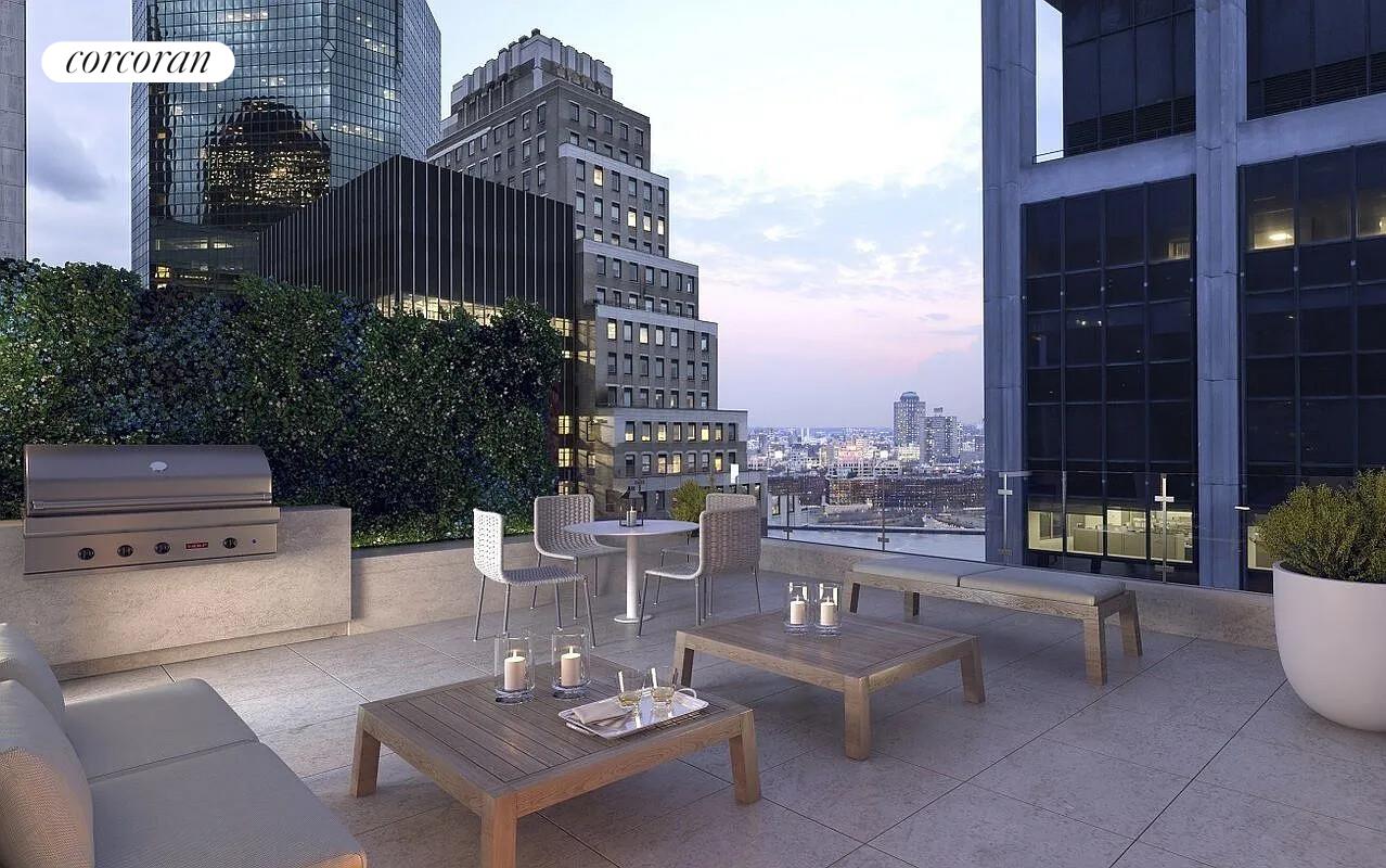 Modern Interiors, lobby with 24/7 Doorman, and full amenities package including fitness studio, resident lounge, and children's playroom, sauna, a golf simulator, and a landscaped rooftop terrace complete with a gas grill and comfortable outdoor seating..