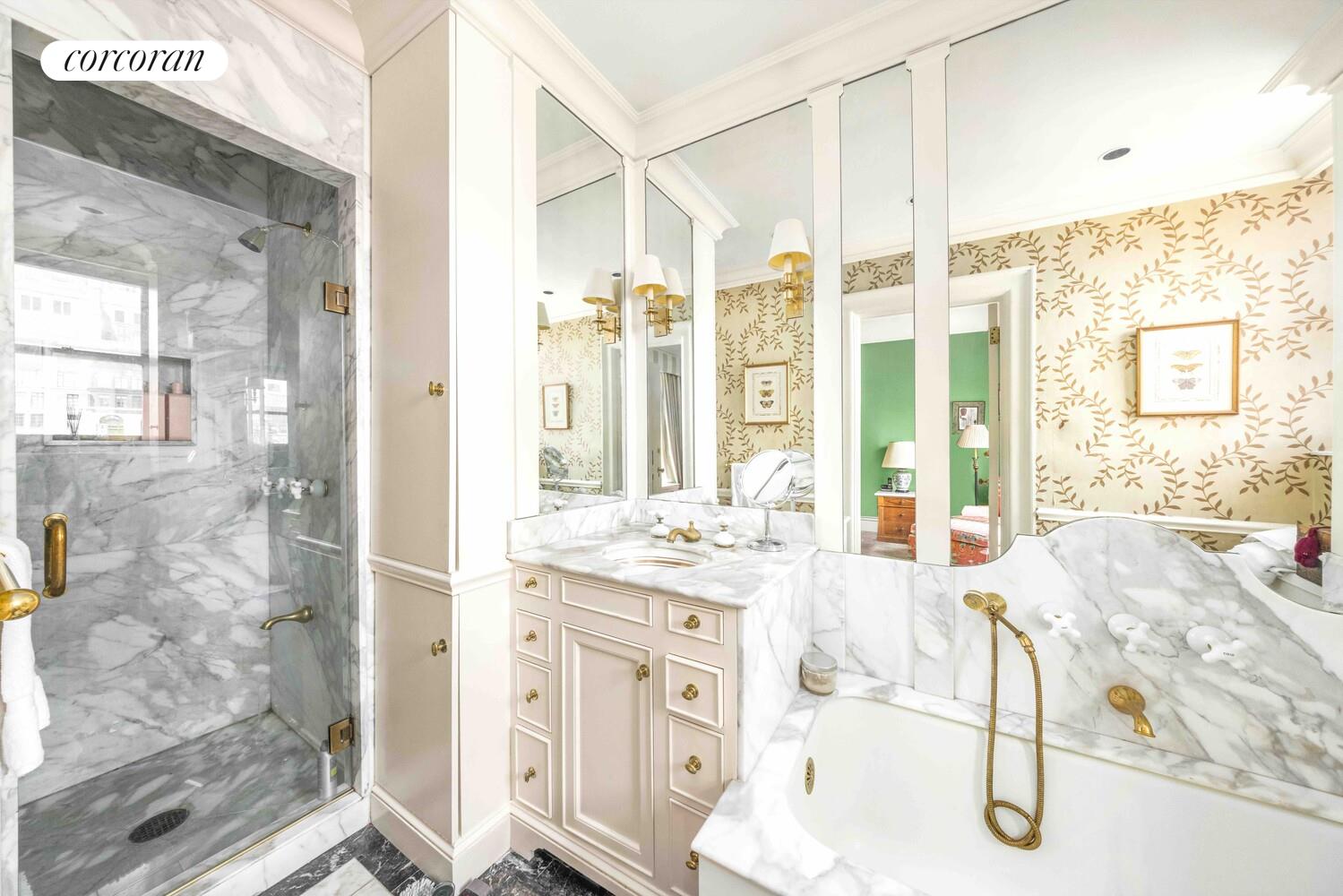 The main level also features three proportioned bedrooms, each with generous closet space, and two marble bathrooms. One bedroom is currently used as a library and another bedroom is currently used as a home office. In addition the bath fixtures and the sinks are all equipped with Cheryl Wagner fixtures (well known for their elegance). Upstairs, three additional bedrooms await, including a grand primary suite facing east with serene morning light, abundant closets, and a sophisticated en-suite marble bath. Throughout the residence, rich hardwood floors, lofty ceilings, and custom millwork elevate every inch of the grand residence. Exceptional closet and storage space is thoughtfully integrated across both levels. The residence also comes with its own large storage unit (in the lower level of 875 Park Ave).