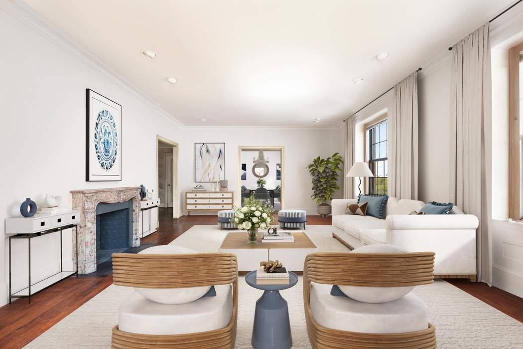 The amply-sized Gallery opens to an impressively-scaled corner Living Room, nearly 28’ in length and featuring oversized windows facing north and east with sweeping views above the surrounding, landmarked townhouses. Adjoining is the Formal Dining Room, equally grand in scale, perfect for both intimate gatherings and large-scale entertaining. Both rooms are blessed with fireplaces.