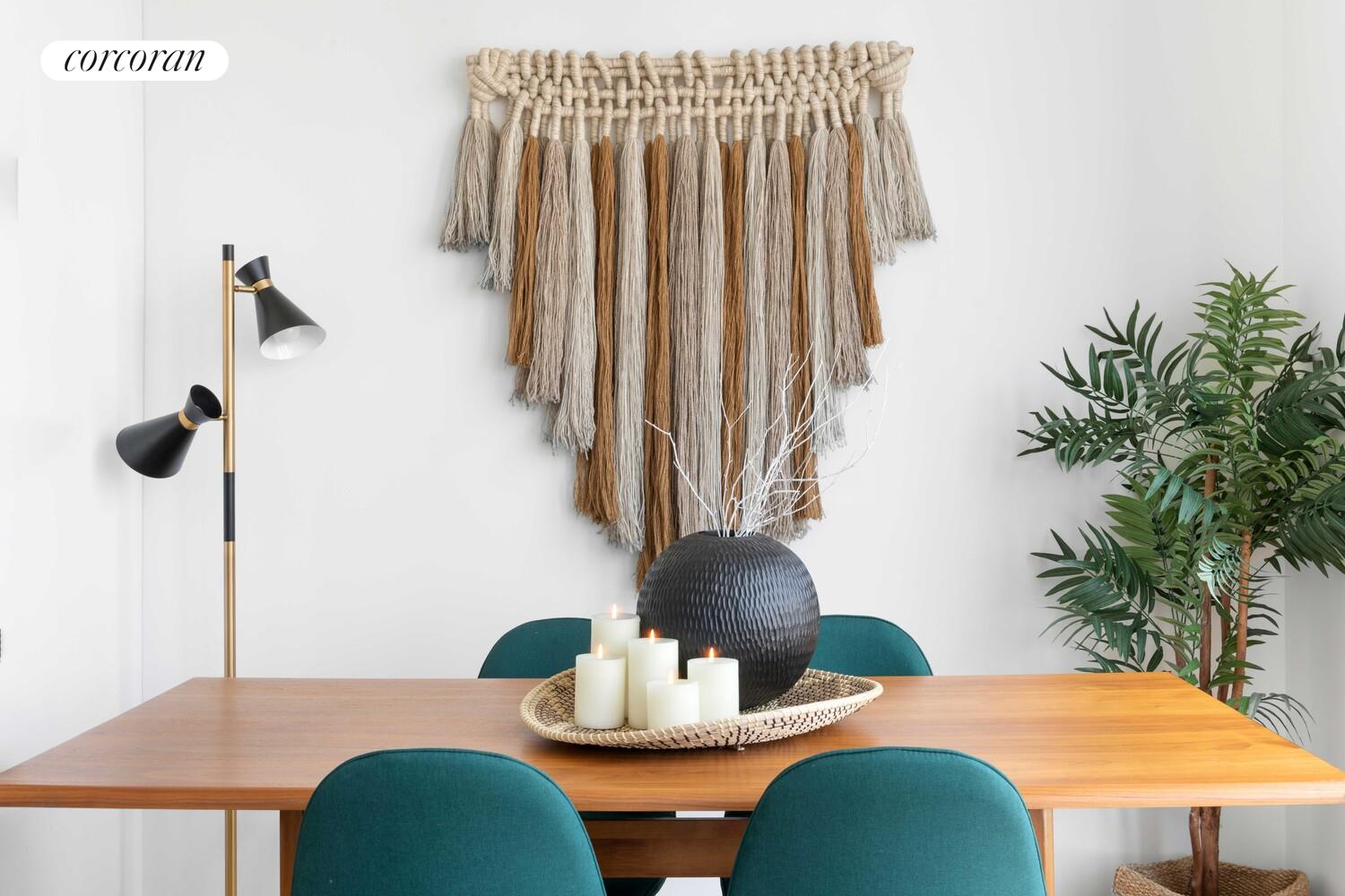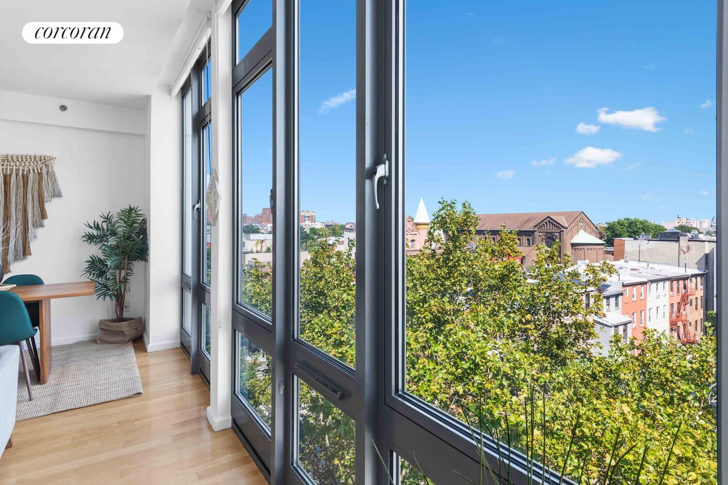 Through the front door, a sun-drenched one bedroom greets you with open concept living, high ceilings, recessed lighting, central air and heat, dining area and stunning floor to ceiling windows with open views of Brooklyn's sky and neighboring buildings.