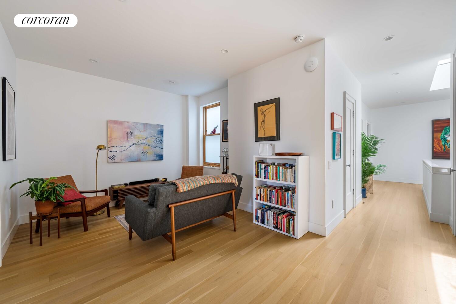 Set on a peaceful, treelined block that connects directly to Prospect Park, the house was reconstructed with a modern living in mind, creating a seamless blend of everyday comfort and smart design. Upon entering, you're greeted with a spacious entry foyer and custom oak stairs that lead up to a space that reads like a singlefamily home. The main living floor opens to a massive, commanding, sundrenched living room at the front.