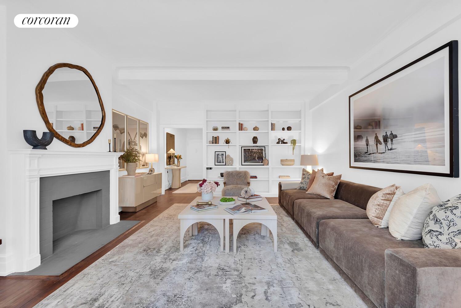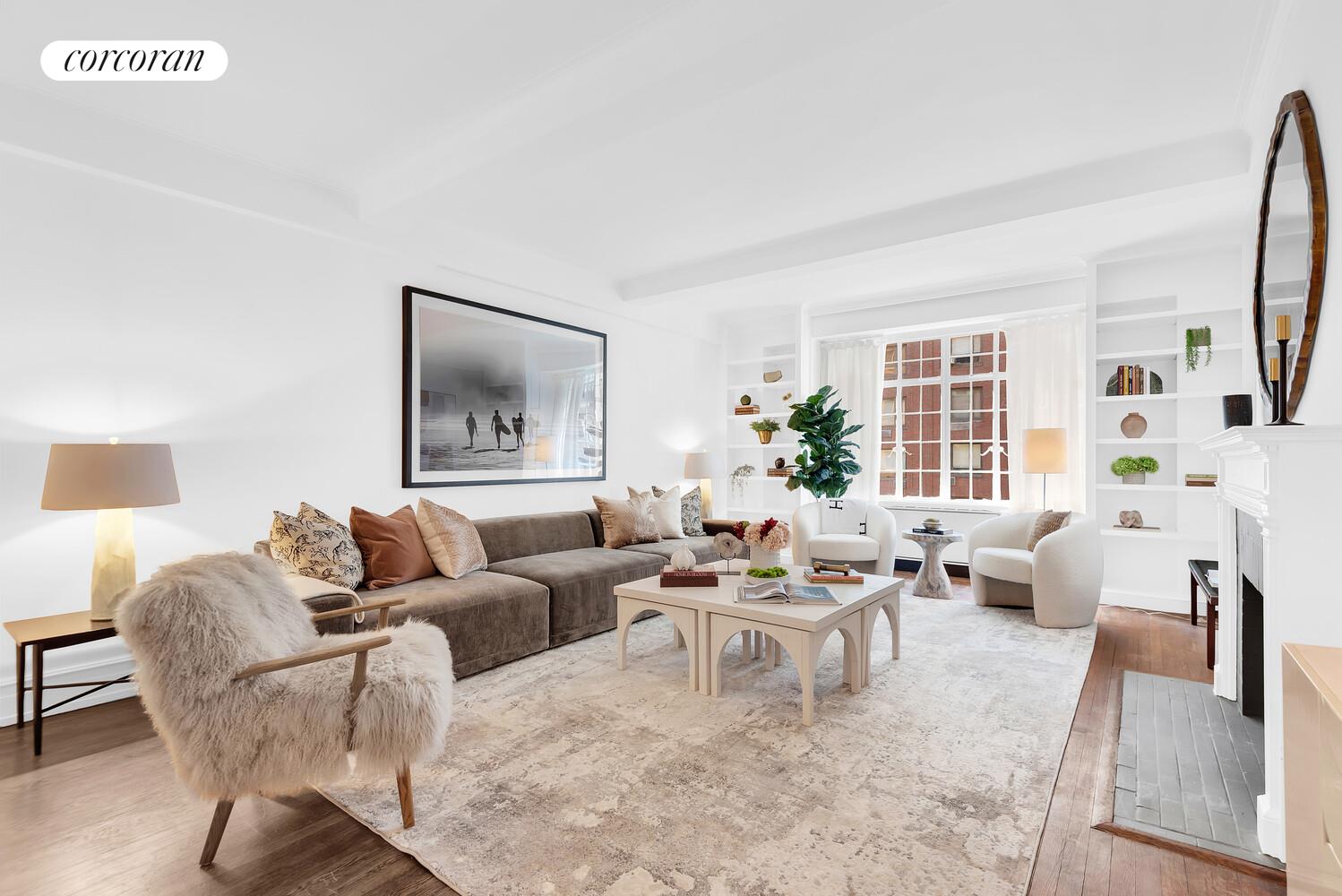 Apartment 6B is a stunning prewar classic six-room (2 bedrooms, 3 baths) residence that exudes timeless elegance and charm. Located on a high floor, this sunlit home offers city views through its expansive south-facing windows overlooking 79th Street. The apartment is a masterpiece of preserved old-world details, featuring soaring 9-1/2' beamed ceilings adorned with cove and crown moldings, a decorative fireplace, and exquisite hardwood floors.