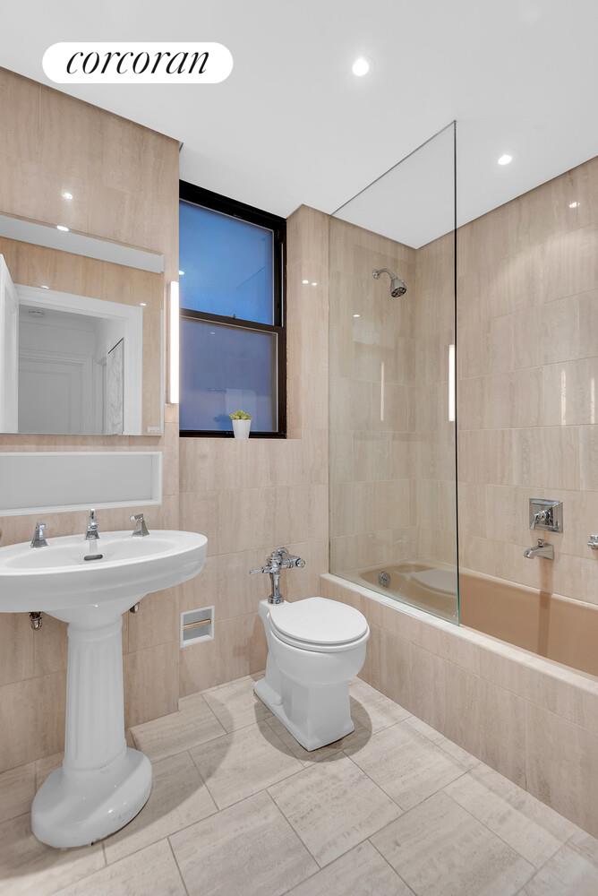 The apartment's traditional prewar appeal is further enhanced by the separation of the bedrooms from the formal living spaces. The primary bedroom is a bright and spacious sanctuary, boasting abundant natural light, two double deep closets, and an en-suite bath with a deep soaking tub. The second bedroom is equally inviting, offering southern views, four deep closets, and a beautifully renovated adjacent full bathroom.