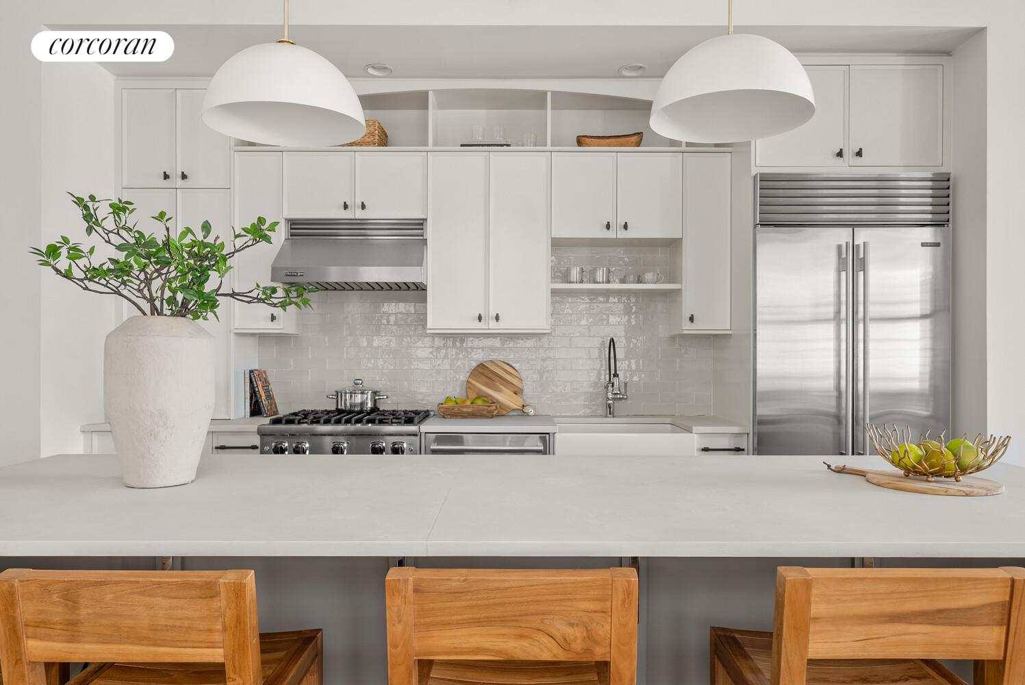 Step into a gracious entry foyer which leads into an expansive 38-foot-long living & dining room. The newly renovated kitchen includes a Farm Sink, Cesar Stone countertops and ceramic backsplash, Sub-Zero fridge, Viking 6-burner range, Bosch dishwasher and 28-bottle wine fridge in an oversized island with bar seating.