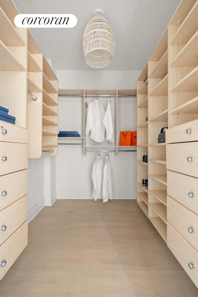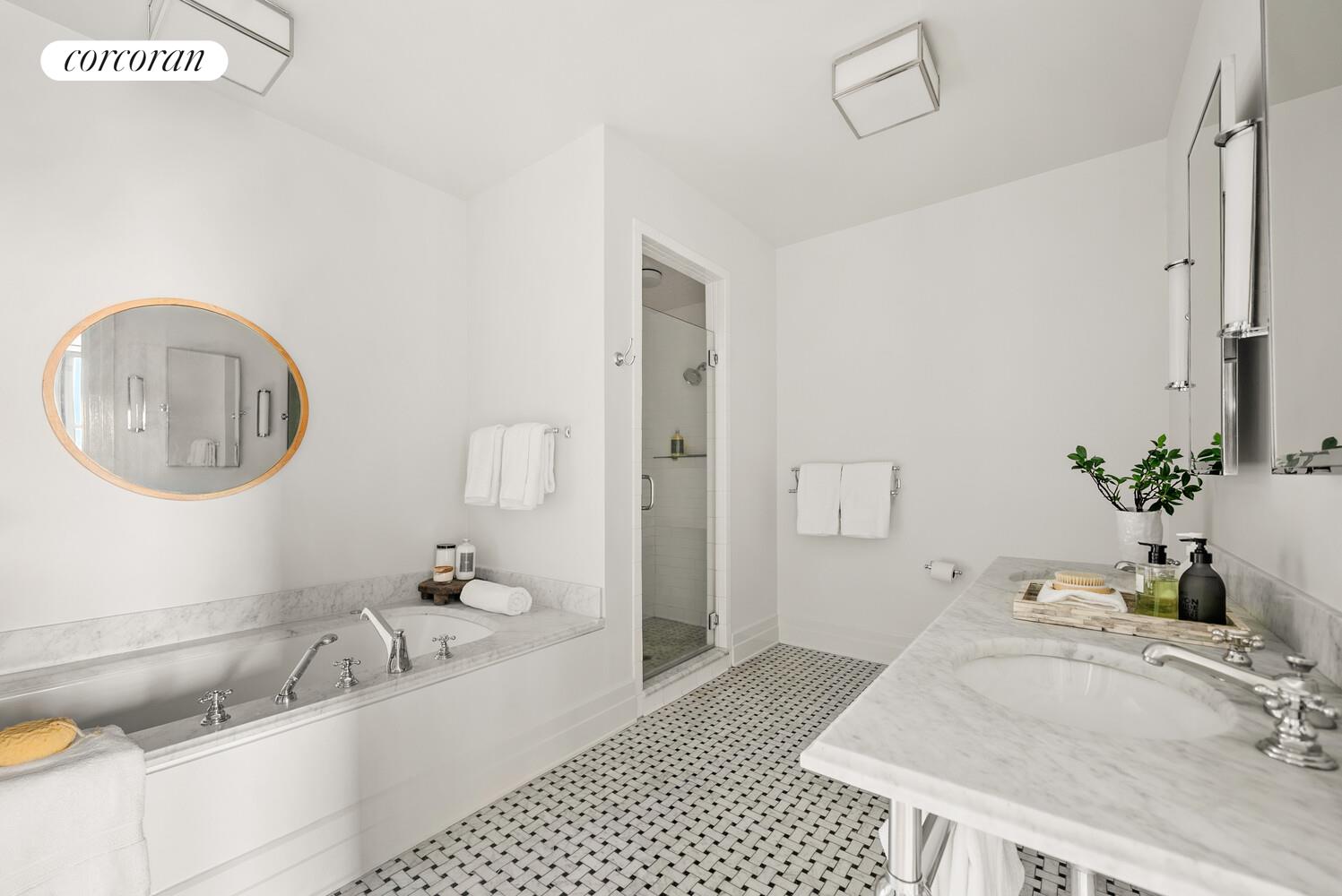 The spacious primary suite features a walk-in closet with custom built ins, barn door closure, and a luxurious Carrera marble clad bathroom with double vanity sinks, a deep soaking tub, and separate glass-enclosed shower. The second and third bedrooms occupy the opposite side of the apartment, providing the upmost privacy for the primary suite. Enjoy maximal utility with a large laundry room featuring a Miele front loading washer & dryer and utility sink. Customizations include built-in shelves with arches mimicking the windows, built in bench in the living room, Central AC, CitiQuiet windows, and roller shades throughout.