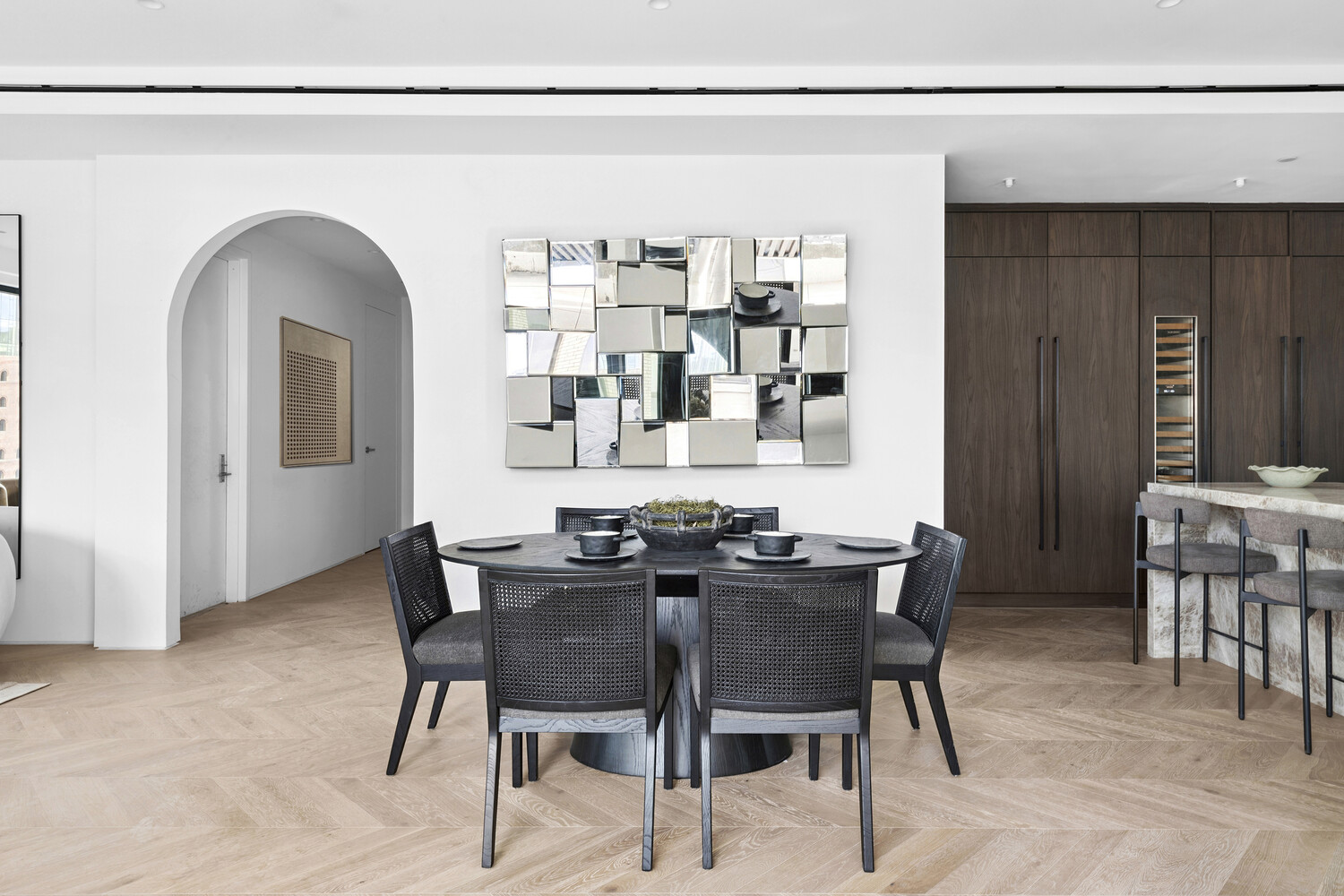 European white oak chevron floors are a signature element of the entertaining spaces, while a powder room and coat closet frame the entry. Elegant pocket doors discreetly separate the residential wing, allowing the living and dining areas to close off for privacy and acoustic comfort.