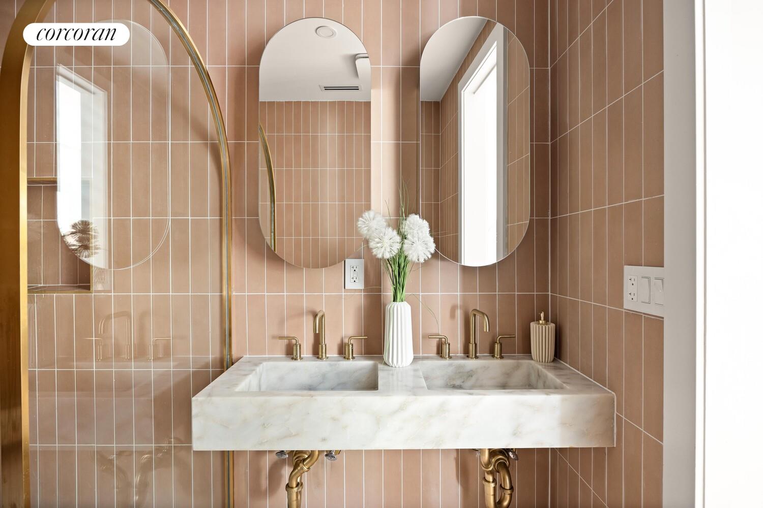 Head up a dazzling staircase with the original hand-carved banister and newel post fully intact. On the top floor you will enjoy three light-filled beds and two full baths. Two beds in back face the garden, and an oversized primary in front looks over the treetops. Enjoy customized closets in every bedroom, including a walk-in primary closet with drawers, hanging space, shelving, and LED lighting. The primary bath is right out of the pages of a magazine with its sophisticated taupe stacked ceramic walls and oversized marble floors. Another marble sink in this bathroom acts as a centerpiece between the freestanding tub and glass enclosed walk-in shower.