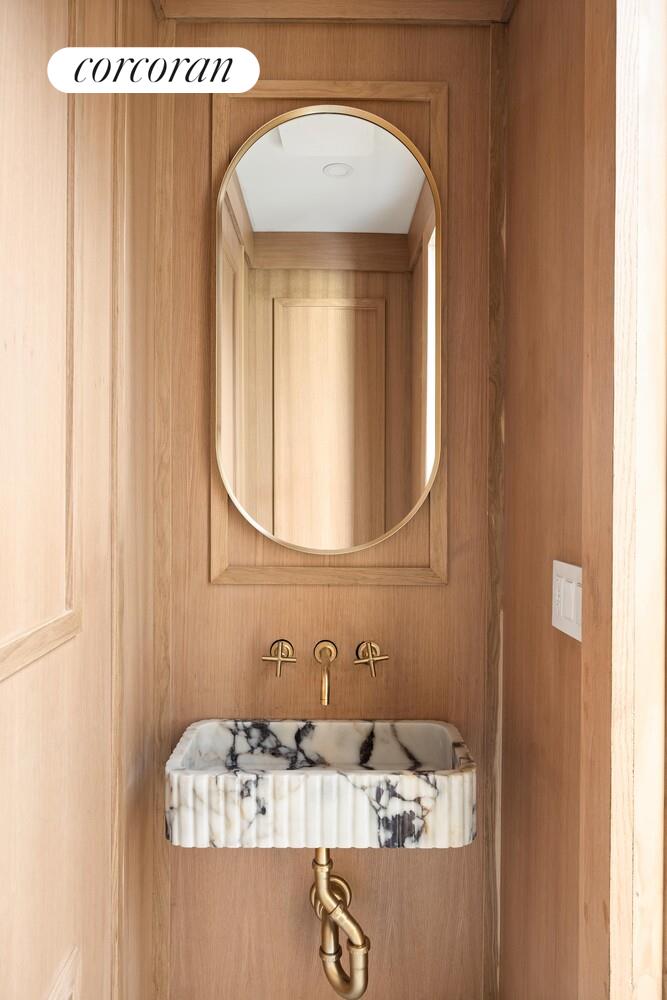 Use the entire house as a grand one-family with 5 beds, or take the upper owner's duplex and collect a substantial rent from the 2-bedroom rental on the garden level. Both units have access to a lush garden accessible from a substantial deck off the parlor floor, or through the back of the rental apartment. The garden is large enough to share, promising an even higher rental income should you decide to give your tenant a taste of the great outdoors. Head up a grand stoop into a magnificent double parlor that you will never want to leave. A marble-floored foyer welcomes you home into a grand space with a large front parlor offering leafy green street views and enough space for formal dining and everyday living. Head through a set of perfectly preserved pocket doors into a chef's kitchen of epic proportions, both practical and stylish. White oak cabinets in a slim shaker style, a fully integrated suite of Bertazzoni appliances, plus a huge dining island, offer a professional backdrop for everyday cooking. Striking Taj Mahal quartz countertops beautifully integrate with the ornate details throughout this floor. Seating for at least four at the island makes this the perfect entertaining kitchen with easy access to a spacious deck right off the kitchen, large enough for outdoor dining and a convenient staircase into the lower garden. There is even a powder room on this floor with a handmade Calacatta Violetta marble sink and wood paneling.