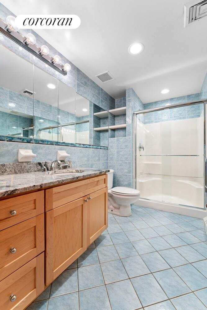 The second bedroom is equally impressive in scale, with oversized windows that bring in natural light and highlight the loft's dramatic ceiling height. Conveniently positioned off the hallway for guest access, the second bathroom is finished in a striking blue tile palette and includes a glass-enclosed stall shower, offering both style and functionality.