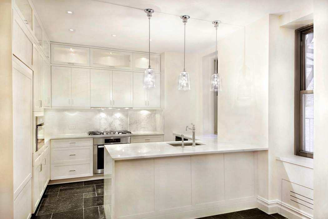 The living room features a decorative fireplace and offers a stunning view of the park. The windowed eat-in kitchen features Miele appliances, a Sub-Zero refrigerator, a wine cooler, and honed marble countertops and backsplash.