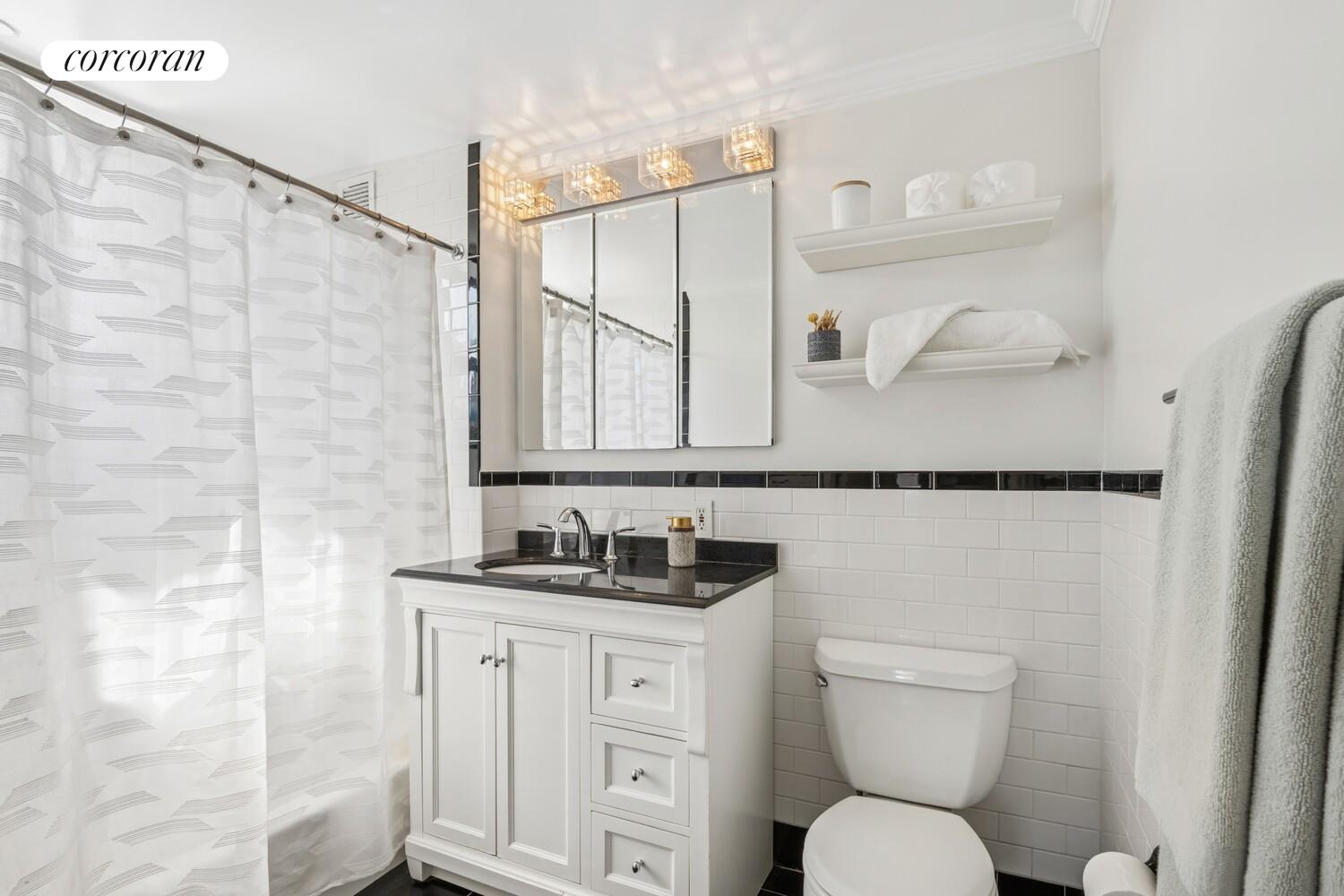 Upon entering, you are greeted by a welcoming foyer that leads into a kitchen with granite countertops, glass tile backsplash, and custom shelving, equipped to meet all your culinary needs. The expansive living area provides ample space for relaxation and entertainment, with large windows allowing natural light to fill the room, creating a warm and inviting atmosphere.  There is a hallway closet, California closet, and linen closet in the unit. The building is wired for Verizon Fios or cable internet.
