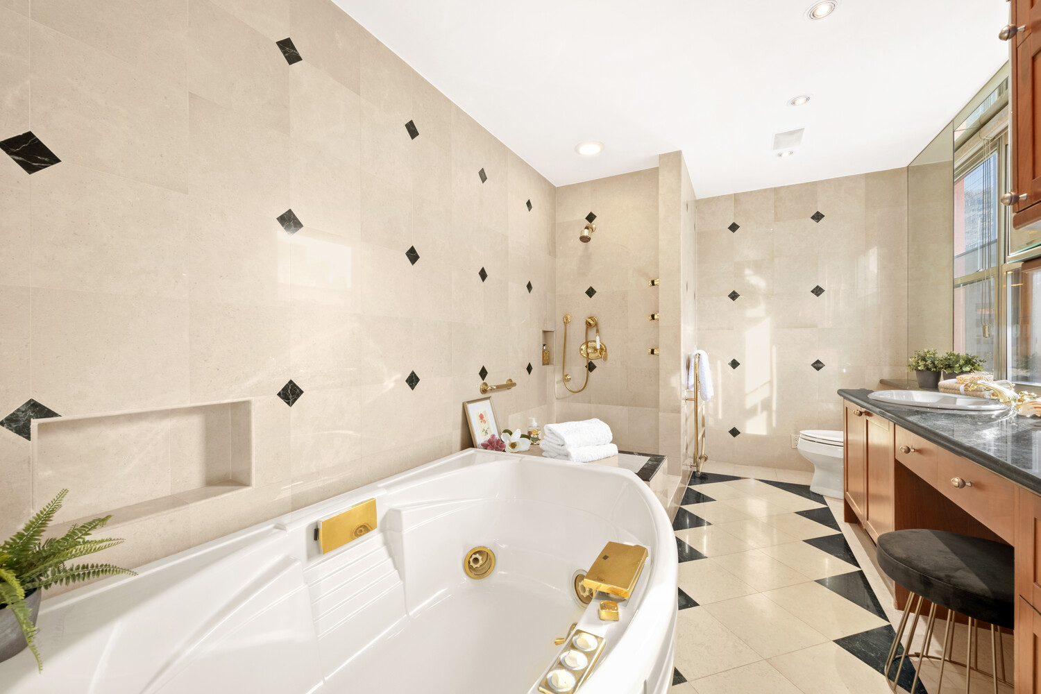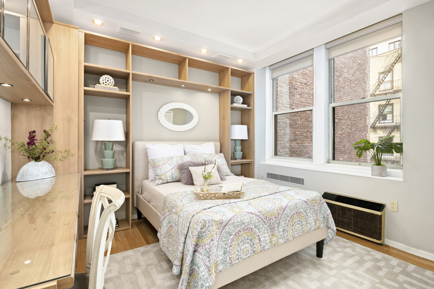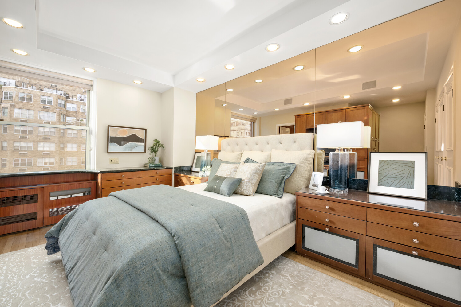 The primary bedroom suite overlooking Park Avenue is a private retreat with wall-to-wall closets, custom built-ins, and a spacious en-suite windowed bath with soaking tub and separate spa shower. A washer/dryer is discreetly located. The large east-facing second bedroom is bright and versatile - ideal as a guest room, library or office - with generous closet space. An adjacent second full bath completes the home.