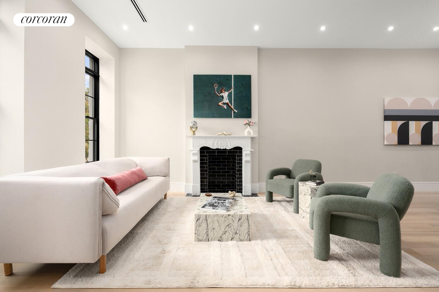The 45-foot parlor floor stretches from a gracious living and dining area with a decorative fireplace straight into a kitchen that anchors the entire home. Wrapped in custom ashy walnut cabinetry and elegant Calacatta marble, the kitchen is as functional as it is beautiful, with Thermador double wall ovens, an integrated dishwasher, and full-height separate Fisher & Paykel refrigerator and freezer framing a perfect wet bar. A discreet pantry adds storage and utility, while oversized sliding glass doors extend the space onto a South-facing deck overlooking the backyard. Even the powder room makes a statement with bold wallpaper.