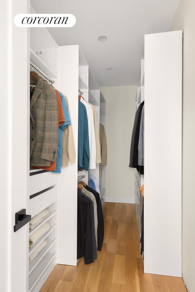 The upper level continues the sense of volume with 10-foot ceilings and abundant natural light from two skylights. The primary suite spans the full width of the home and features dual closets, including a fully built-out walk-in, and a serene spa-style bath with soaking tub beneath a skylight. Two additional bedrooms, a laundry closet, and a dedicated linen closet complete the level with both beauty and function.