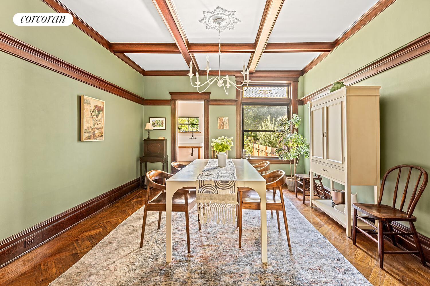 You're immediately welcomed by a charming front porch, the perfect spot to enjoy your morning coffee or unwind with an evening tea. Upon entry, the foyer offers a convenient space for coats, shoes, and bags. The bright and inviting living room has an oversized window with custom blinds. Pocket French doors lead to a formal dining room, complete with a coffered ceiling and decorative medallion, ideal for hosting your next dinner gathering.