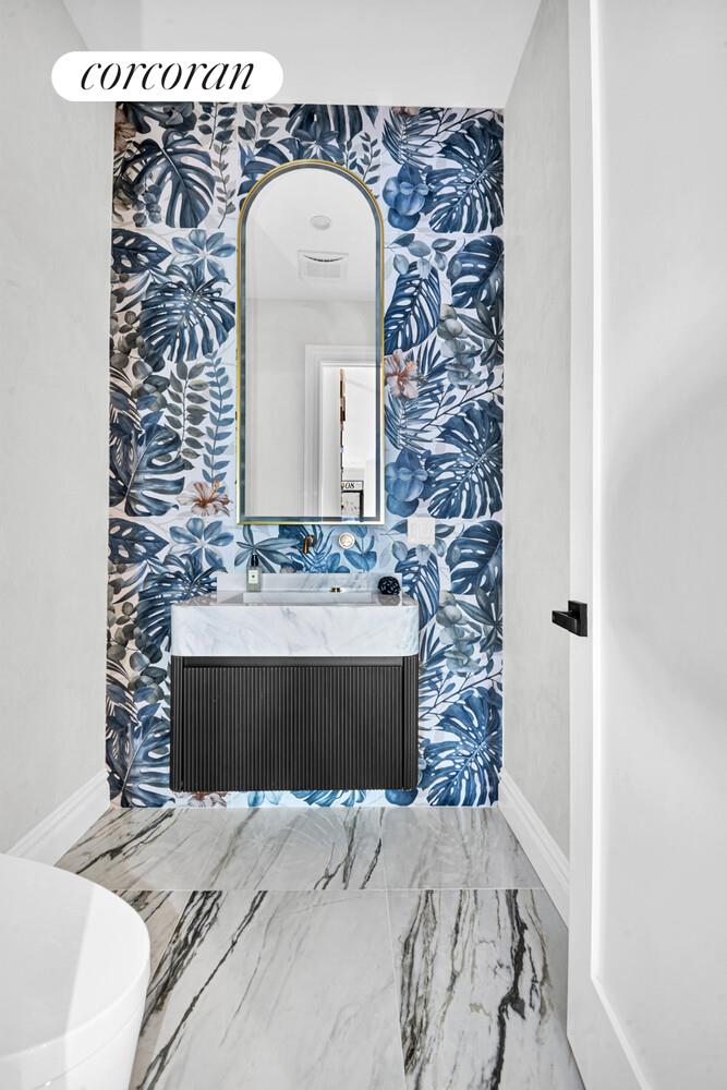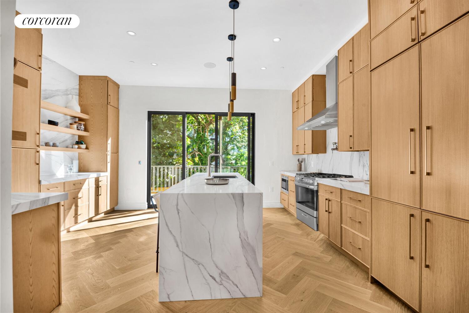 Step inside to a dramatic parlor level where soaring ceilings, crisp herringbone white oak floors, and abundant natural light set the tone. The grand living and dining areas flow effortlessly into a chef's kitchen designed for both daily living and elevated entertaining. Custom cabinetry, thick quartz island and countertops, pot filler, vented hood and a suite of high-end Bertazzoni and Dacor paneled appliances anchor the space. A built-in wet bar, wall mounted wine display and coffee station add convenience and sophistication, while double sliding glass doors extend the living experience onto a full-width deck overlooking your private backyard oasis. The kitchen's open layout, combined with Bluetooth speakers integrated into the smart home system, creates the perfect atmosphere for hosting and everyday relaxation. A chic powder room with floating stone vanity completes this level.