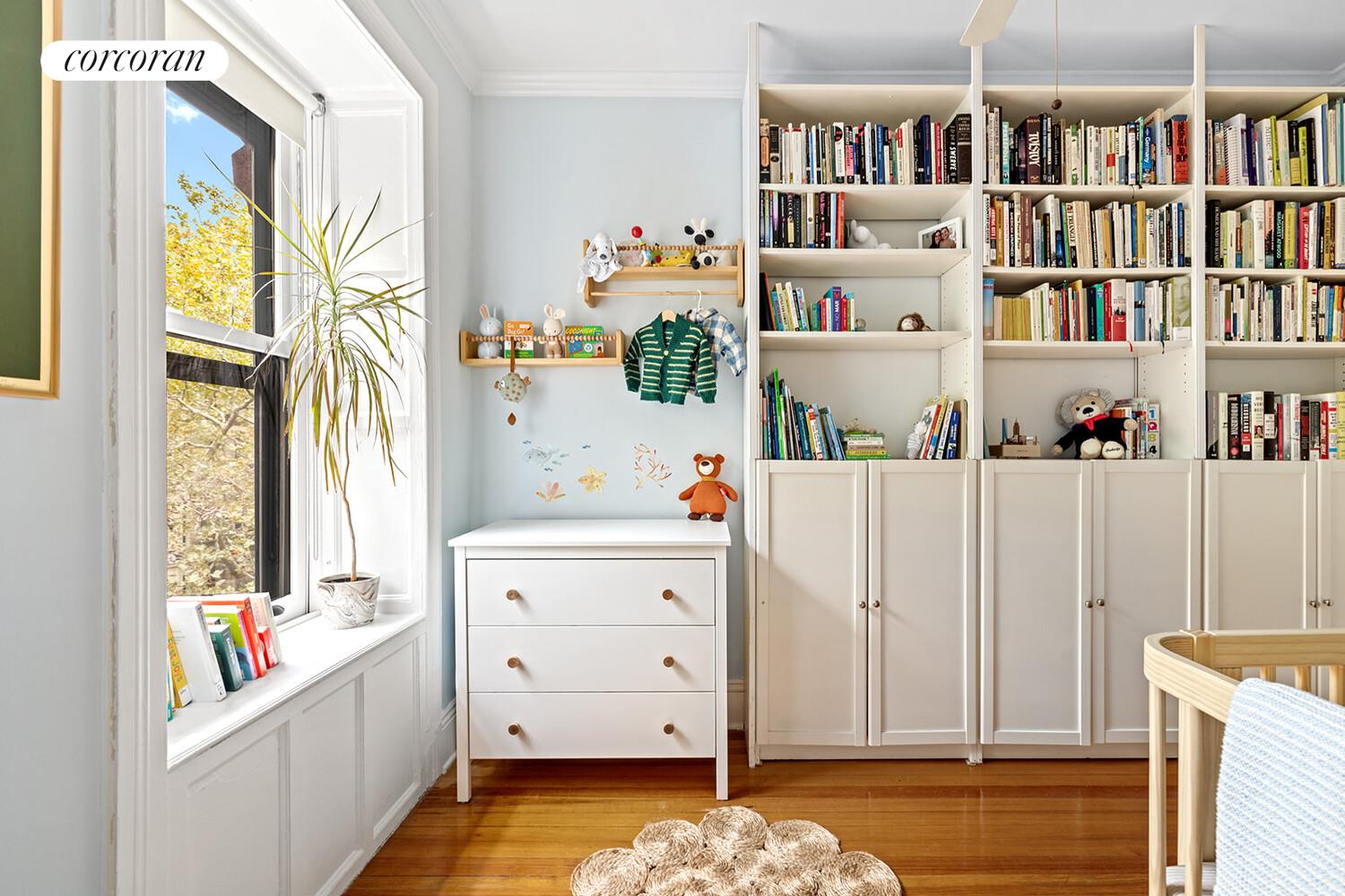 The south-facing primary bedroom offers a peaceful retreat with a decorative fireplace and an outfitted double closet. The second windowed room, used currently as a child's room, has built-in shelving and a deep closet, is perfectly scaled and could also function as a generous home office.