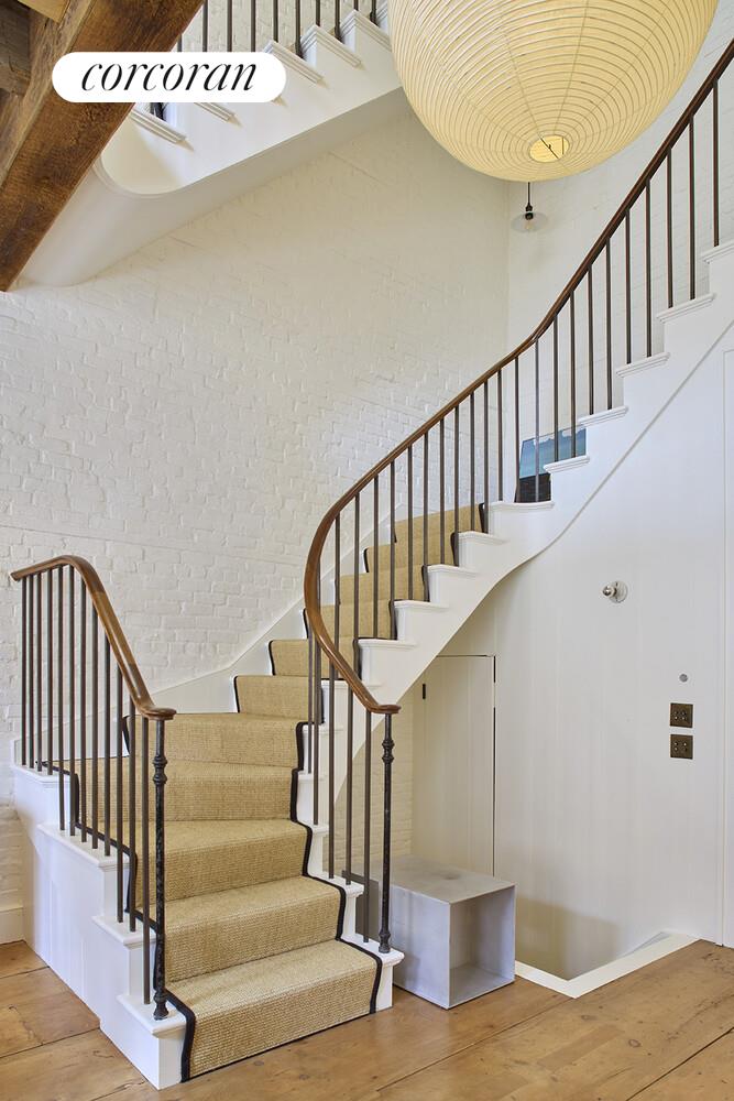 The residence is defined by soaring interiors and a dramatic 4 story staircase at its core. Original wide board floors and hewn beams reclaimed from an 18th-century barn, along with imported doors from an English country estate, lend a sense of history and permanence. Every detail has been carefully curated to create a home of both refinement and comfort.