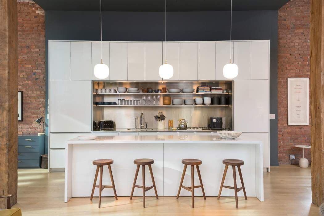 At the heart of the home is the fabulous open chef’s kitchen, featuring Italian RIFRA white lacquer cabinetry, a massive 10-foot island, and integrated Sub-Zero refrigerator and Bosch appliances, including a dishwasher, oven, cooktop, and retractable range hood. The custom-built-in seating and workspace showcase a perfect eat-in kitchen, thoughtfully designed for your everyday needs. Overlooking the gracious, light-filled living space, the kitchen exudes a sense of functionality and warmth perfect for both everyday living and entertaining. The combination of a modern design on this industrial backdrop creates one spectacular space.
