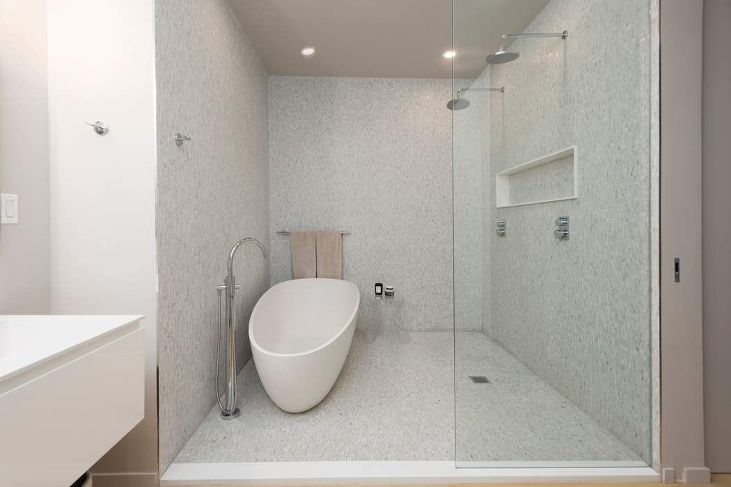 Descending from the main living area, you’ll encounter the primary suite, a glamorous and serene retreat featuring a spacious, fully customized walk-in closet and dressing area. The en-suite bathroom evokes a spa-like ambiance with dual rain showers, a freestanding soaking tub, a custom wall-mounted double vanity, and custom cabinetry.