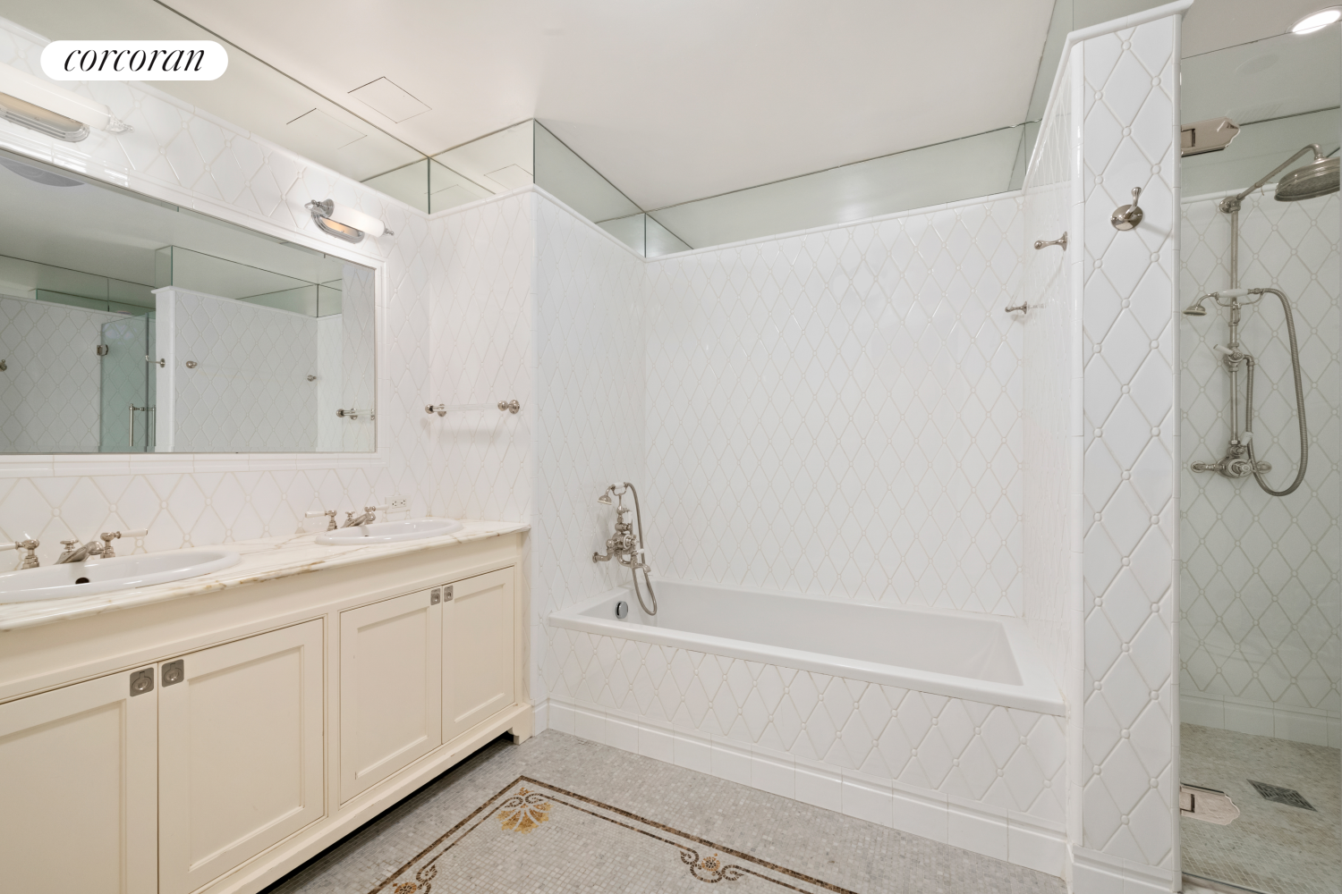 The rooms of 1807 at 1 Central Park South are grand in proportion offering a large living area with room for dining and a generously sized bedroom with en-suite bath. The primary bath and the powder room feature a custom marble mosaic patterned floor derived from the historic Plaza lobbies with fixtures and fittings exclusively crafted by Lefroy Brooks and Kohler. The custom gourmet kitchen has appliances by Viking and Miele with Nero Marquina stone counter tops and a white mosaic Calacatta marble tile backsplash.