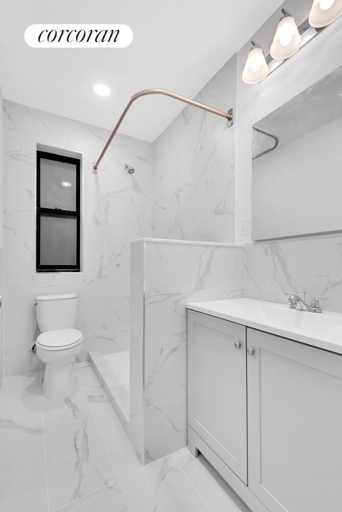 An inviting dining foyer leads you to a brand new kitchen with breakfast bar, custom cabinetry in white, Calacatta Valentin Quartz countertops in warm white plus undermount sink by Elkay and glazed ceramic backsplash in bright white tile. In addition, the stainless steel appliance package is designed by Haier and GE and includes a dishwasher and microwave.