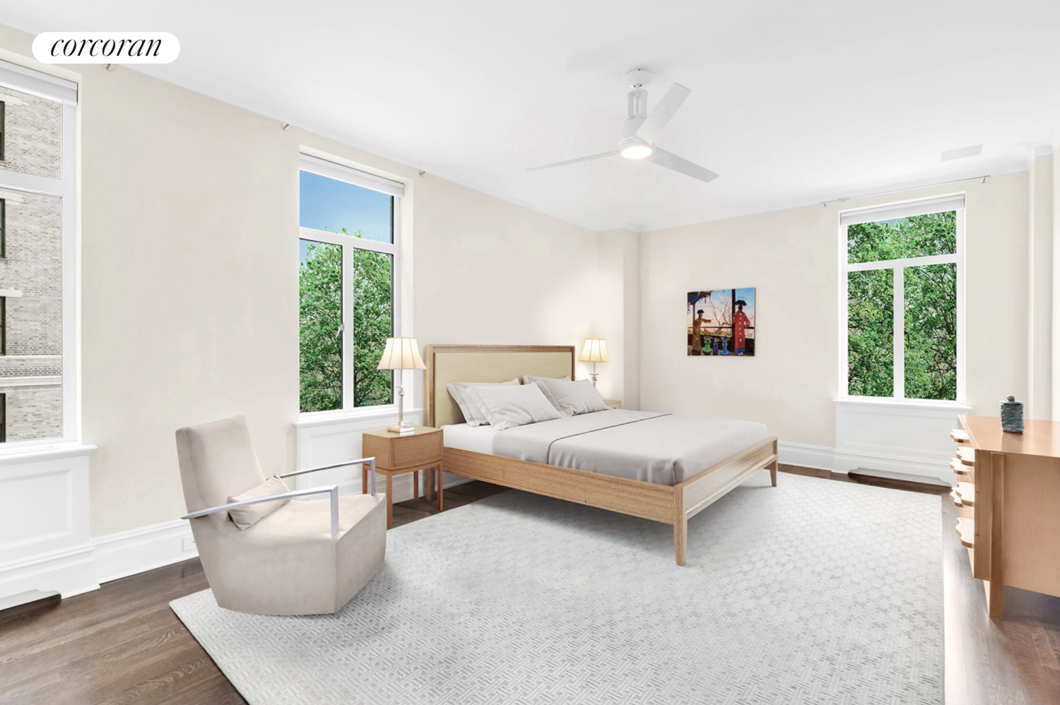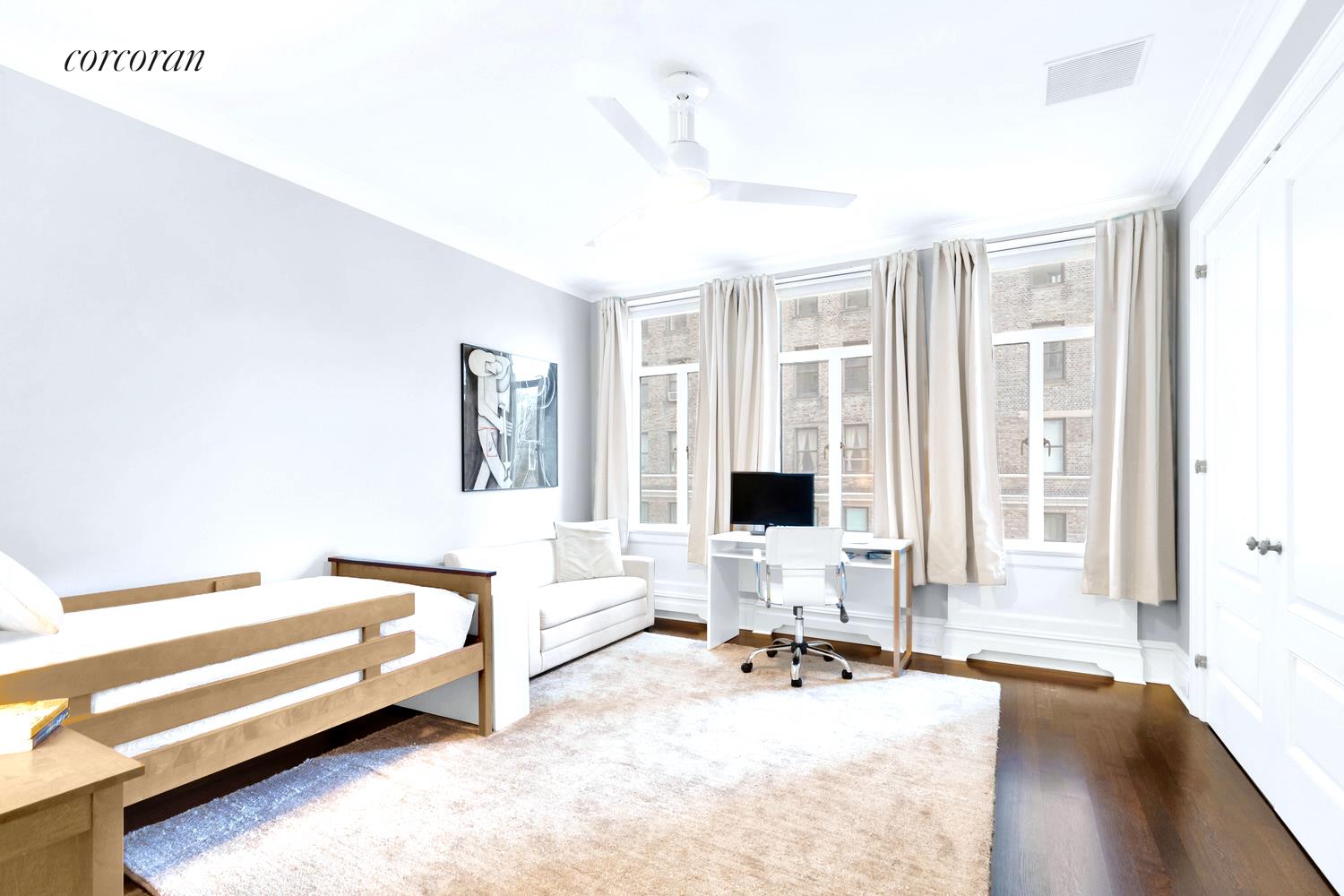 The 25-foot chef's kitchen defies description. Cook for a crowd on an amazing array of professional appliances like a Viking 36-inch range with vented hood, 6-foot Subzero refrigerator freezer, 2 Miele commercial dishwashers, miles of sleek cabinetry and splendid composite counters. In a separate wing reside a serene primary bedroom with wonderful Park views east and north and a handsome bath ensuite. A second bedroom, also with ensuite bath, overlooks the Park. Bedrooms three and four face a pastoral section of West 82nd Street and are served by a generous hall bath.