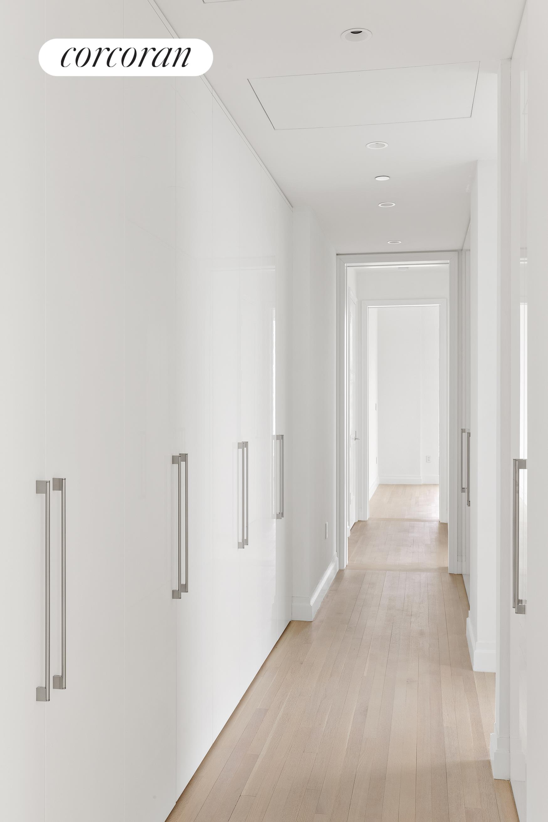 With interiors designed by Deborah Burke, a modern and elegant foyer leads to an expansive 29" 3" x 29" 3" living / dining room with Northern and Eastern exposures of Central Park and skyline. Clean lines lead to a separate eat-in kitchen with a window framed marble breakfast bar. The kitchen overlooks Central Park, finishes include custom white-lacquered millwork, marble floors and countertops, an oak finished center island, with an appliance package by Miele. A separate service entrance directly leads to a private service corridor connecting the northern and southern wings of this residence, allowing for maximum privacy.