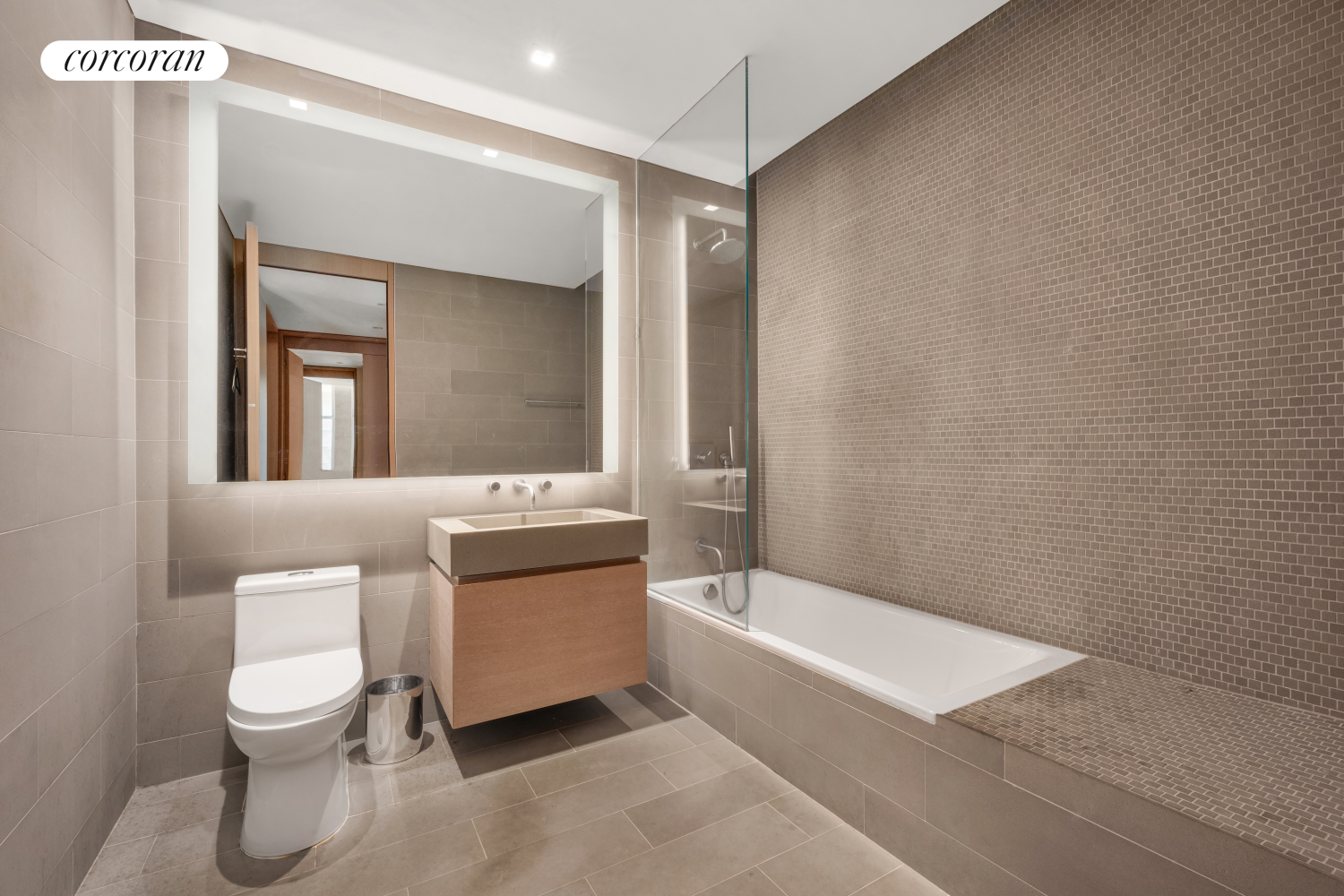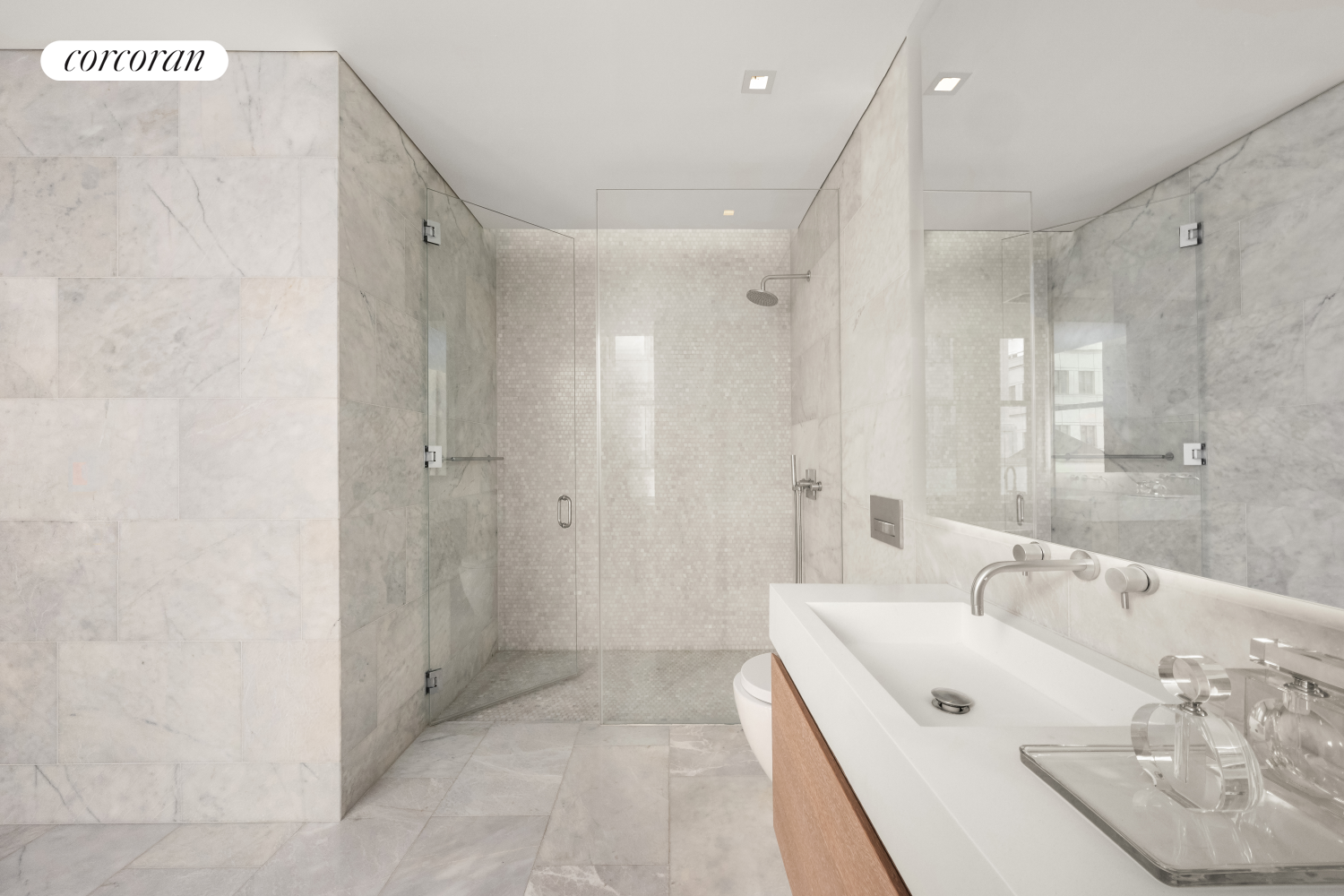 The serene and oversized primary suite exudes quiet luxury, offering a gracious sense of scale, custom built-in closets, and an en-suite bath reminiscent of a Roman spa. Clad in honed Ariel White marble and illuminated with soft cove lighting, the five-fixture bath features custom Apaiser stone vanities, a deep soaking tub, elegant framed mirrors, and radiant heated floors.