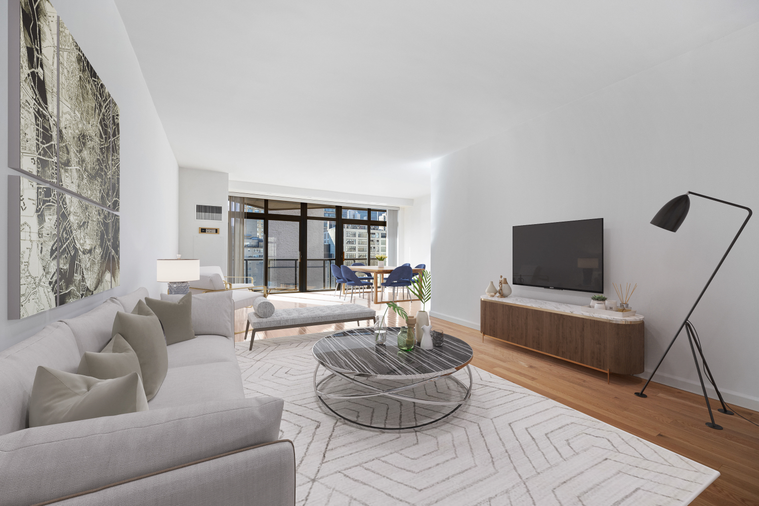 Beautifully renovated turnkey 2-bedroom, 2-bathroom apartment located at 100 United Nations Plaza, one of Midtown East's premier white-glove condominium buildings. Apartment 20E features 1,321 interior square feet, 2 private balconies totaling 144 square feet, 9-foot ceilings, floor-to-ceiling windows, a split-bedroom layout, central heat, A/C, and gorgeous oak hardwood flooring throughout.