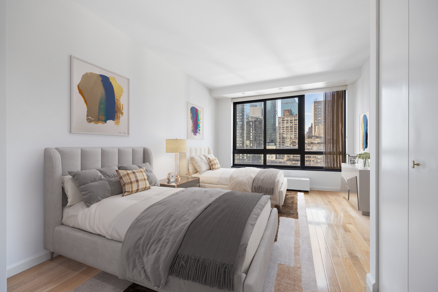 The large, quiet primary bedroom with panoramic northern city views has an en suite bathroom and an outfitted walk-in closet. The bathroom was renovated with Calacatta Gold marble, Dornbracht and Hansgrohe fixtures, and custom-built cabinets. The spacious second bedroom has a renovated en suite marble bathroom with tub and two large closets. Alternatively, this room can be used as an office with space to accommodate a sleeper sofa, media console, and desk. The powder room was adapted into laundry facilities and can be converted back to a half bathroom.