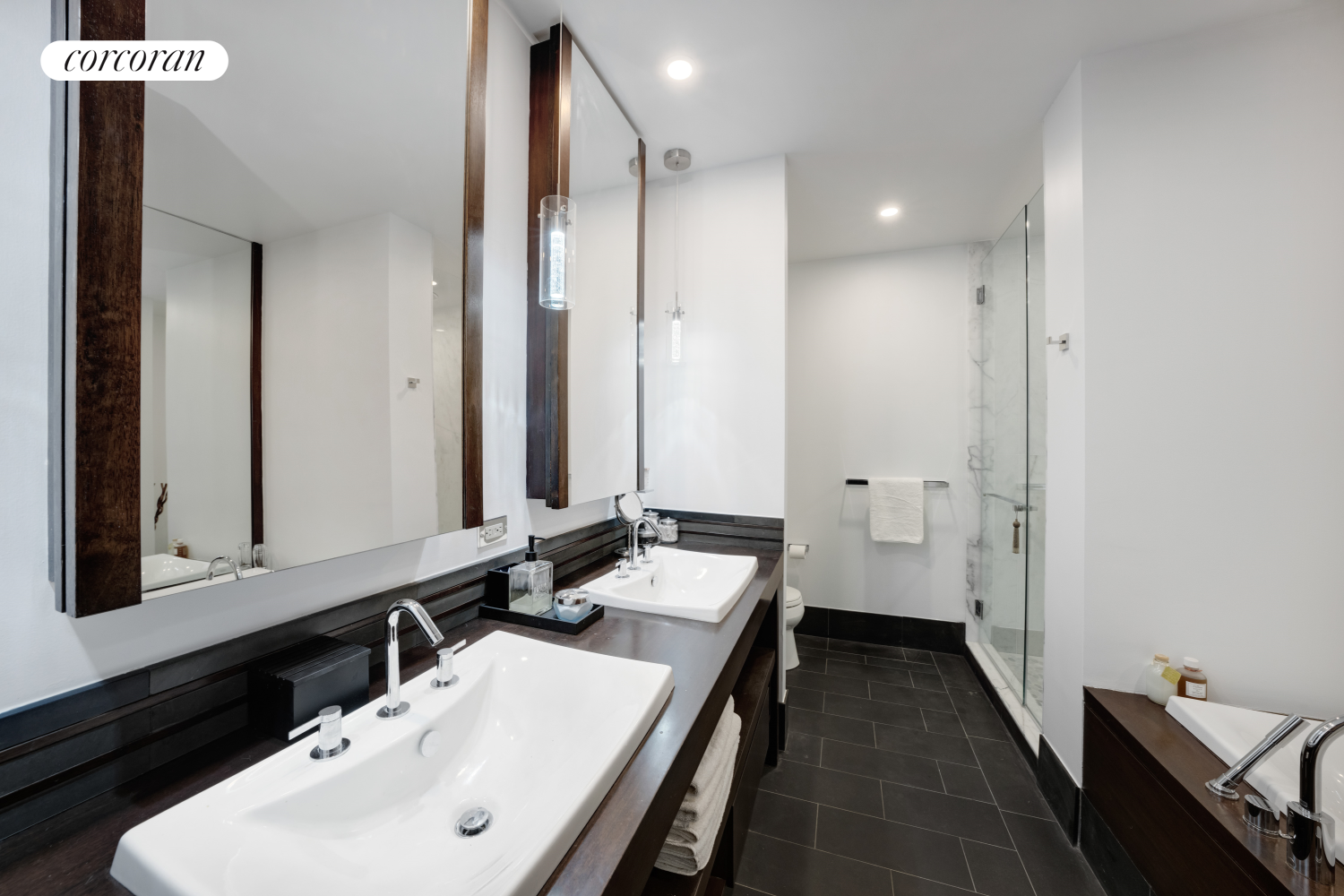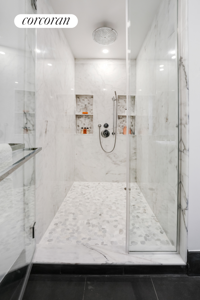 The generous bedroom offers abundant closet space, including a custom California Closet that transforms the dressing area into an organized, stylish retreat. The en suite spa-like bath features a stunning white dual-sink vanity. Indulge in the separate soaking tub or unwind in the brand-new, custom marble rain shower-thoughtfully remodeled to create a serene escape.