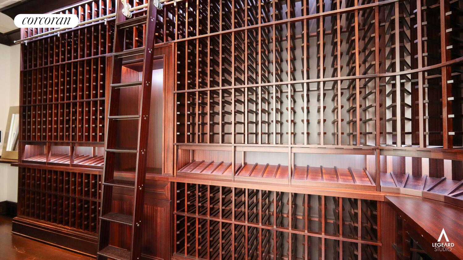 Take the handsome staircase or the state-of-the-art elevator to the second floor, where a luxe dining room sits beneath soaring 11-plus-foot ceilings with herringbone hardwood floors, a gas fireplace, a wet bar, and a wine lounge capable of housing over 1,000 bottles. The living room adjoins the dining room and has oversized windows, a wood-burning fireplace framed in white onyx and mahogany, radiant heat floors, and a powder room.