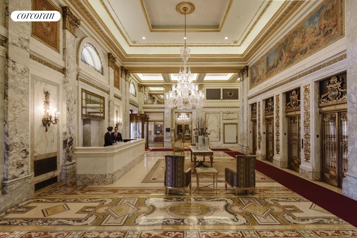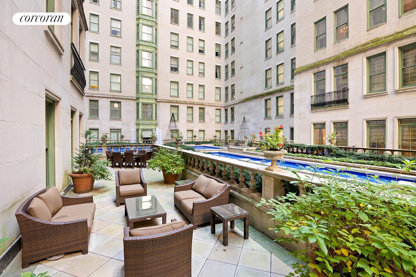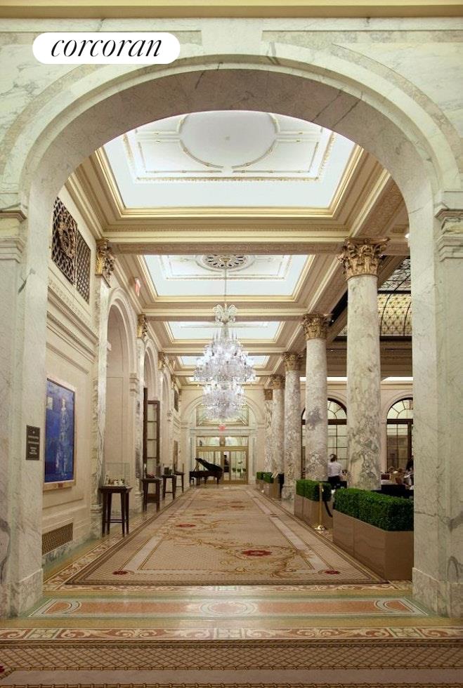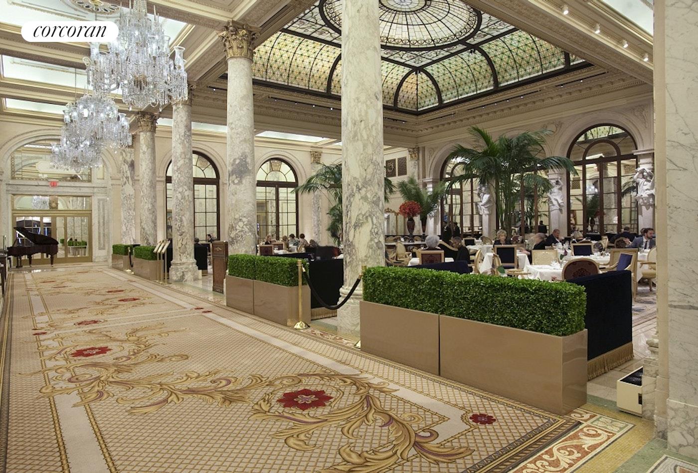 The grand suite with a private door to the landscape terrace. The second guest suite faces the beautiful landscape terrace also, and nicely appointed with a custom closet. The stunning kitchen has custom-made cabinetry, beautiful Nero Marquita stone countertops, white mosaic Calcutta marble backsplash, and top-of-the-line stainless steel appliances by Viking and Sub Zero And two zoned central-air for this unique and special apartment. The Palm Court, Guerlain Spa, Grand Ballroom, and Terrace Room. Experience Manhattan's premier living destination, proximity to Central Park, glamorous Fifth Avenue shopping, internationally acclaimed fine dining, and the best of New York City.