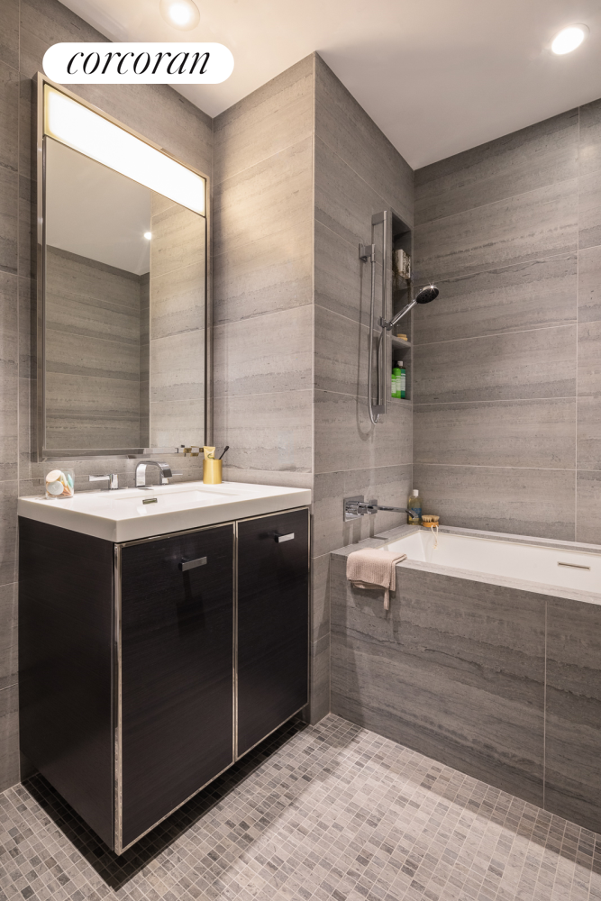 Residence 8J is a 696 square foot one bedroom, one bathroom with an open gourmet kitchen and breakfast bar. This spacious residence faces North East with East River and Williamsburg Bridge views. Warm, modern interiors are brought to life by the renowned design team at Meyer Davis Studio. This residence features imported stone and custom finishes, premium Miele appliance package, 5" wide stained oak flooring, master bath with custom wood cabinetry, marble tile walls and mosaic floors with radiant heat, under-mount Wetstyle sink with glass vanity top and Dornbracht polished chrome faucets and a washer and dryer.
