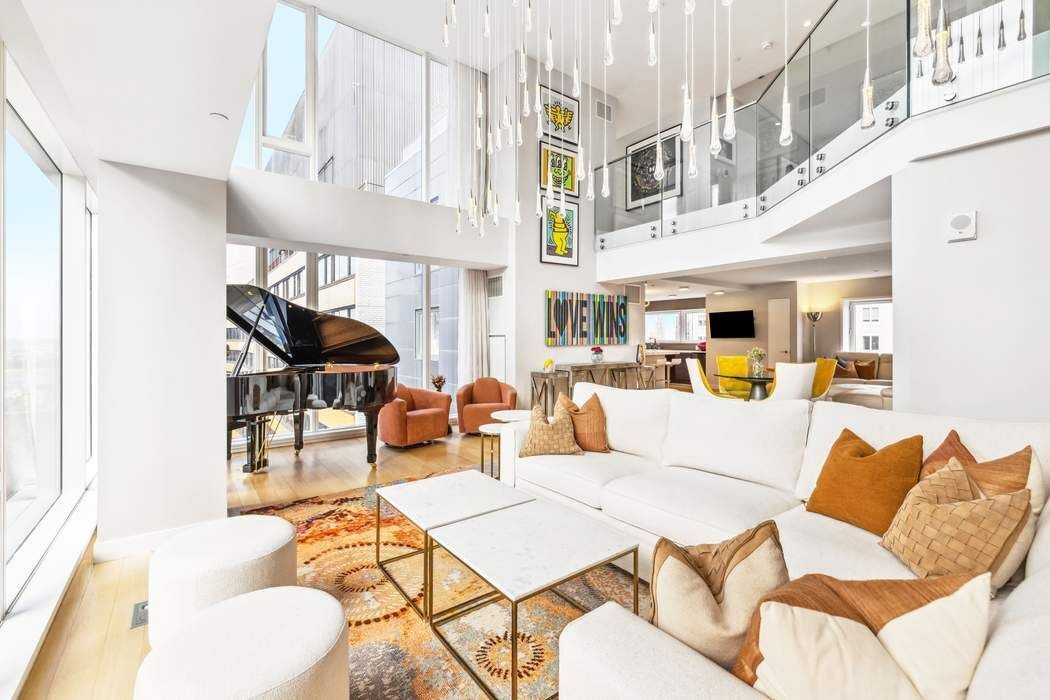 Upon arrival, your elevator opens into your private elevator landing, which flows into a tremendous double-height great room with soaring 18-foot ceilings and floor-to-ceiling glass walls, allowing natural light to pour in from sweeping southern and western exposures. The open-concept layout flows effortlessly into a formal dining area and a masterfully designed chef's kitchen featuring top-of-the-line Miele appliances and exquisite Calacatta marble countertops.