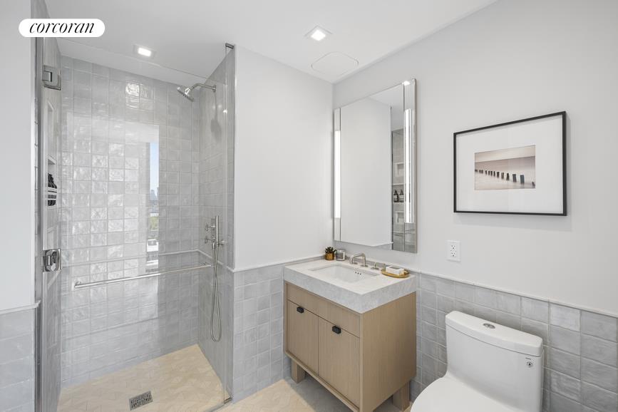 Primary bathrooms have mosaic marble flooring, modern walnut vanities and custom glaze ceramic tiles. Waterworks features are throughout. Secondary and half baths feature bespoke ceramic tiles with marble flooring and elegant vanities.
