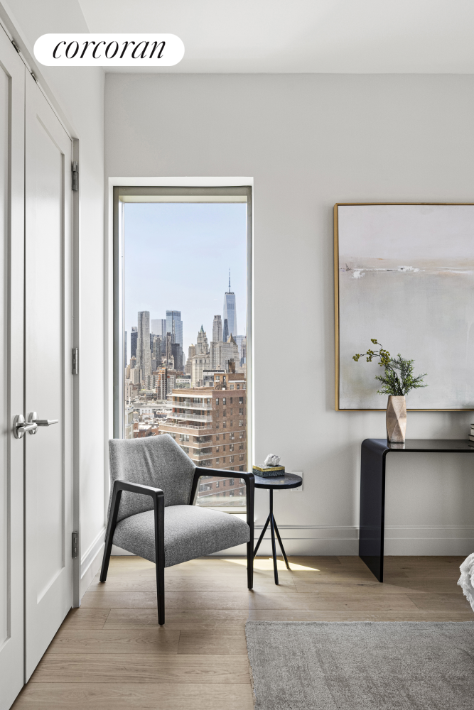 This well-appointed corner exposure 706SF one bedroom one bath home has stunning views of the World Trade Center and downtown skyline, framed by floor-to-ceiling windows.7-inch-wide plank white oak flooring runs throughout the residence. The well-planned L-shaped kitchen is outfitted with top-of-the-line Miele, Bosch and Subzero appliances, Zellige tile back splash and